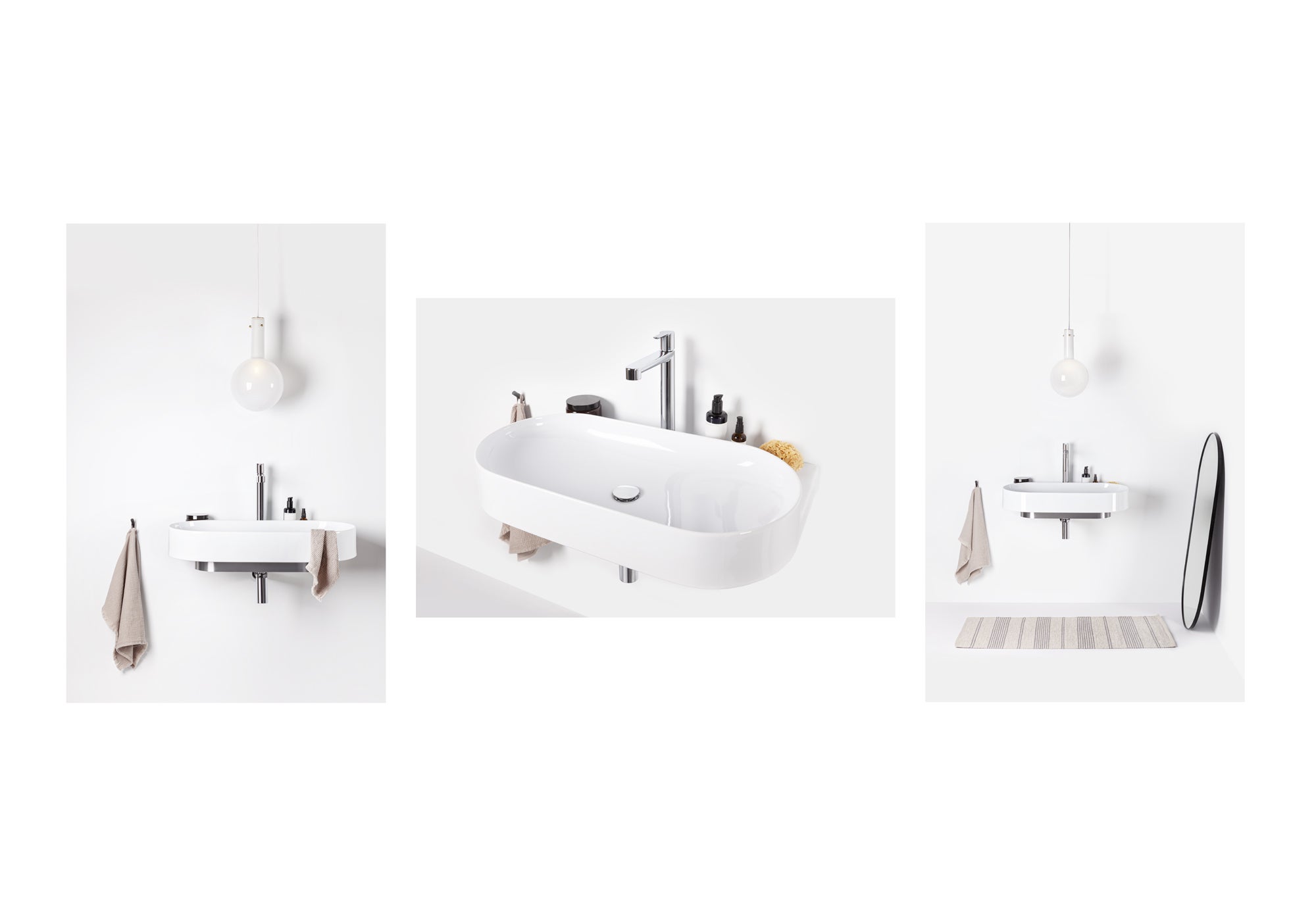 Celkový dojem z nového setu keramických tenkostěnných umyvadel výrazně ovlivňuje harmonické prolnutí lineárních a cirkulárních tvarů. Kulatá či oválná umyvadla v rozměrech 40, 60 nebo 80 cm, rohové umyvadlo o průměru 45 cm i malé kulaté umývátko doprovází hranatá odkládací plocha. Lineární tvary působí v koupelně neinvazivně, nechávají proudit energii uživatele a umožňují plné soustředění na vlastní prožitek. „Toto přenesení do svého světa, v určitém slova smyslu jakýsi portál do prostoru, kde chci trávit čas, nás inspirovalo i při vytváření expozice v Superstudiu,“ uzavírají její autoři.