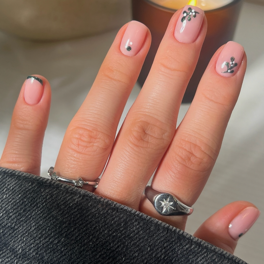 Jmelí tvoří neodmyslitelnou součást vánočních tradic. V dávných dobách se věřilo, že pouhá přítomnost jmelí v domě pomáhá s početím, a díky této pověře se dodnes pod ním líbáme. Do zimních trendů na nehty se něžné větvičky jmelí se dostaly pro svou křehkou krásu a silnou symboliku. Drobné bílé bobule na svěže zelených větvičkách působí čistě, zejména pokud je necháte bez dalších vánočních motivů. Tento jemný nail art se skvěle hodí pro příznivce přirozeného vzhledu a romantických detailů.