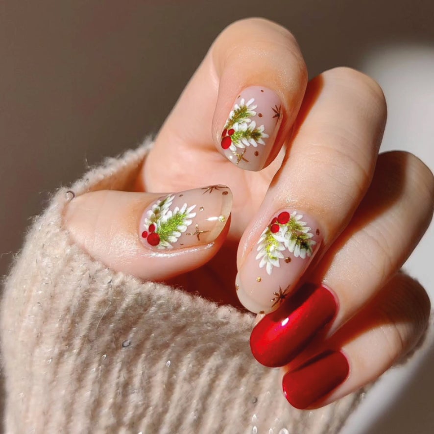 Koule, ozdoby, řetězy, hvězdy, vánoční hvězdy a girlandy z jehličí. Všechno, co visí na stromku a kdekoliv v domě, se letos přesouvá i na nehty. Vánoční nail art inspirovaný výzdobou je nejodvážnější kategorií: metalické odlesky, kombinace červené, zlaté, zelené a třpytivé detaily, které nehty promění v minigalerie. Skvělé pro Silvestr nebo vánoční party, kdy se sváteční manikúra stává hlavním statementem celého looku.