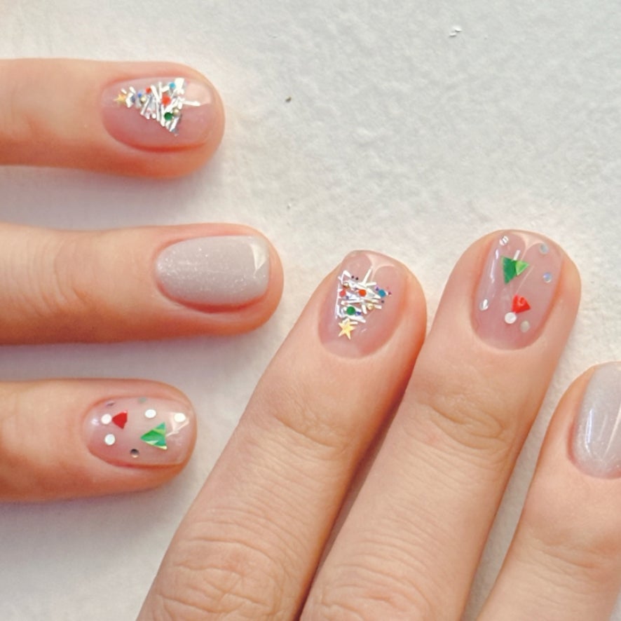 Nehty s motivem vánočních stromečků jsou klasika, která se v roce 2025 vrací ve výrazně sofistikovanější podobě. Místo dětských malůvek přicházejí stylizované trojúhelníky, minimalistické linie a jemné třpytky, které vypadají jako světýlka v dálce. Tahle varianta sváteční manikúry skvěle funguje na krátkých i dlouhých nehtech a sluší jí jak tmavě zelený lak, tak nude podklad jen s náznakem barvy.