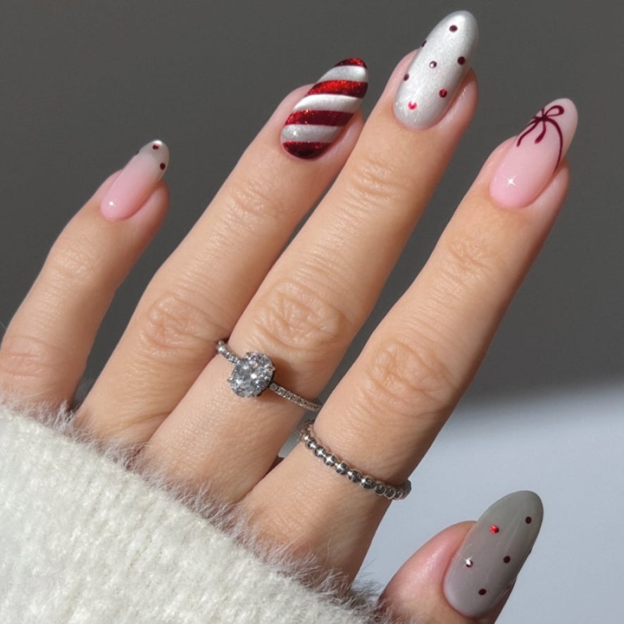 Vánoční nehty inspirované dárkovým papírem a mašlemi jsou letos tou nejroztomilejší verzí sváteční manikúry. Tenké proužky připomínající stuhy, minimašličky a puntíky jako z vánočních balíčků promění každý nehet v malý dekorační objekt. Tento dekor je ideální pro ty, kteří chtějí hravý vánoční nail art, ale pořád v elegantní podobě – něco mezi cukrovím a francouzskou manikúrou.