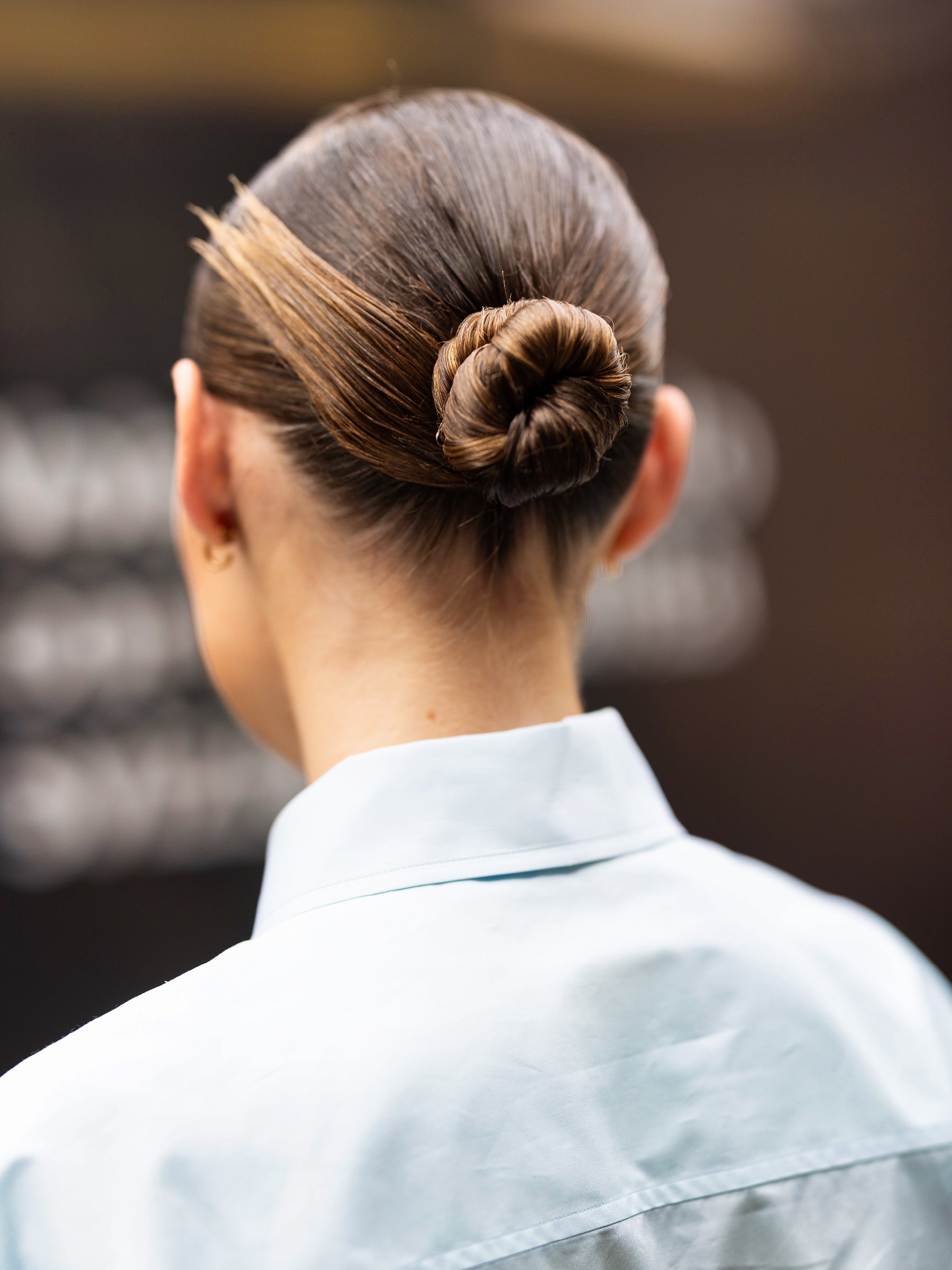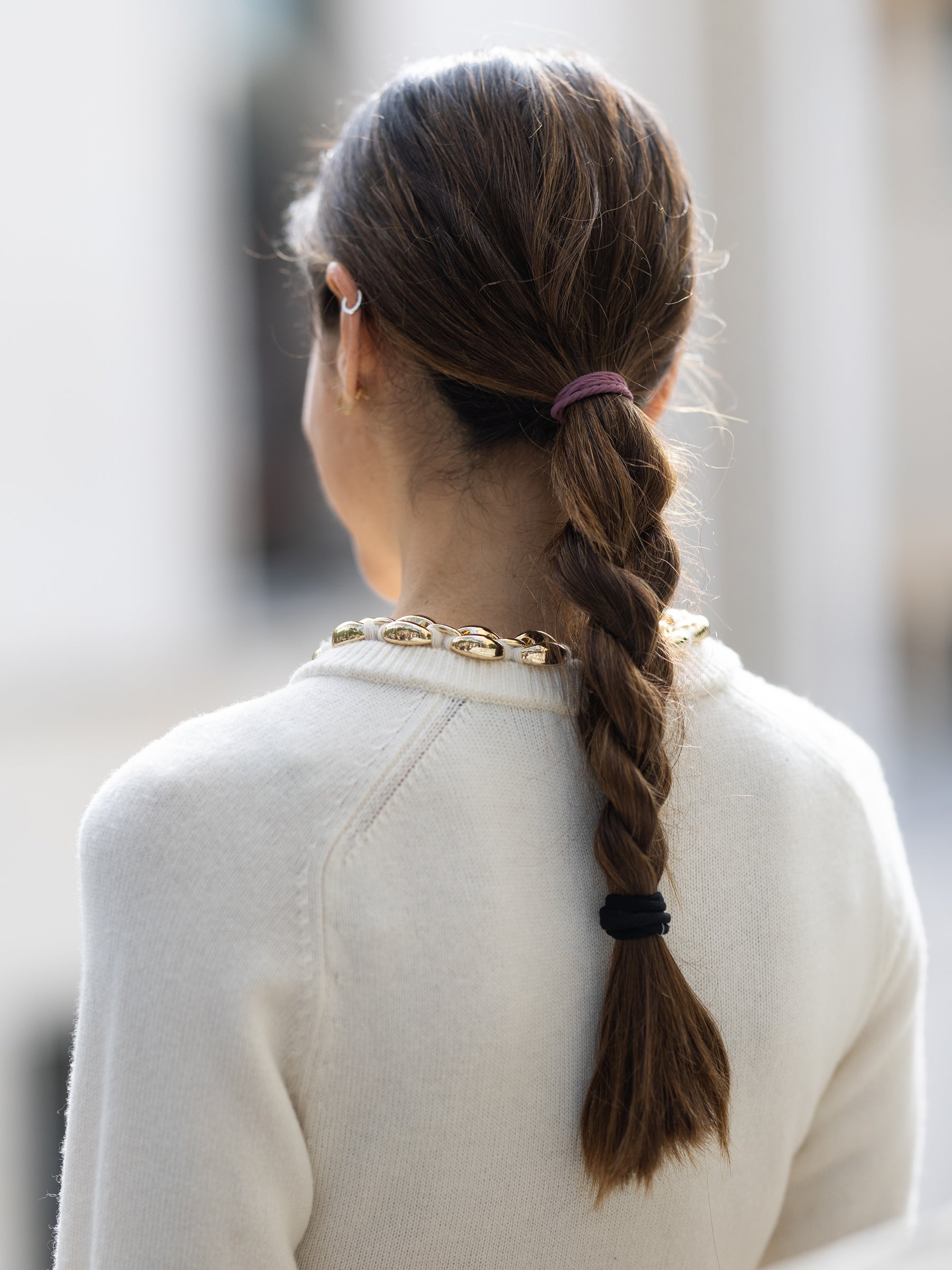 Stejně jako se šatník zjednodušuje směrem ke quiet luxury, tak i vlasy si získávají méně komplikovanou podobu. Ty dlouhé stačí stáhnout do culíku nebo zaplést do klasického copu se základnou na týlu. Důležité je vlasy důkladně stáhnout do pevného culíku a dokonale uhladit stylingovým krémem, gelem nebo olejem, aby jemné vlásky nepoletovaly, ale držely se celý den pěkně u hlavy. Látkovou gumičku z předchozích sezon vyměňte za tenkou a v ideálním případě ji jedním pramenem zakryjte. Nebo sáhněte po hladké kovové sponě.
