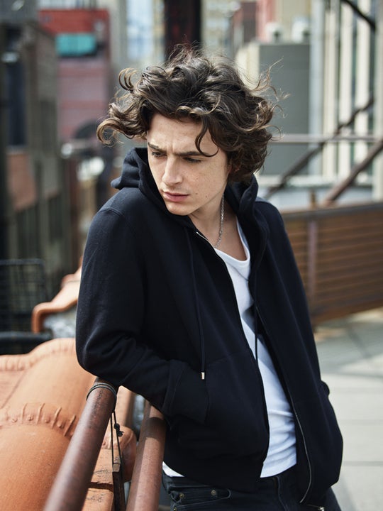 Další potěšující zprávy: Chalamet pro hlavní roli připravovaného filmu o Bobu Dylanovi nahrál všechny vlastní vokály a natáčet se začne letos v létě v New Yorku. „Připravoval jsem se na to celou věčnost,“ říká s povzdechem. Právě teď to zahrnuje každodenní sezení s hlasovým trenérem, i když, jak sám říká, se na to připravuje už od dob studií na umělecké škole. „Nemůžu čekat, že to někdo mimo newyorský veřejný školský systém bude vědět, ale na LaGuardii existuje představení Cabaret, ročník 2013, které si můžete pustit na YouTube,“ říká hrdě – hlubší ponoření do YouTube odhalí, že je také docela dobrý tanečník. „Vzpomínám si, že kritik New York Times Ben Brantley o tom říkal moc hezké věci, takže to zdůrazním.“