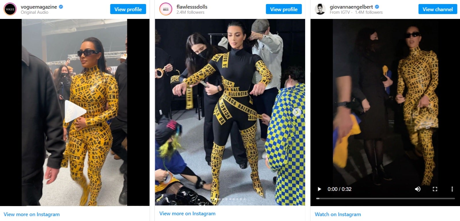 V březnu se například Kim Kardashian zúčastnila přehlídky Balenciaga na sezonu podzim/zima 2022 v divokém looku: výstražnou páskou s logem značky si polepila celé tělo, které při každém kroku vydávalo skřípavé zvuky. Můžete ji napodobit a vytvořit si vlastní DIY variantu, nebo si pořídit verzi stejného outfitu za 63 dolarů přes Yandy. Jejich kostým se jmenuje „Work Harder“, což je narážka na proslulou hlášku samotné Kim: „Nobody wants to work these days“.