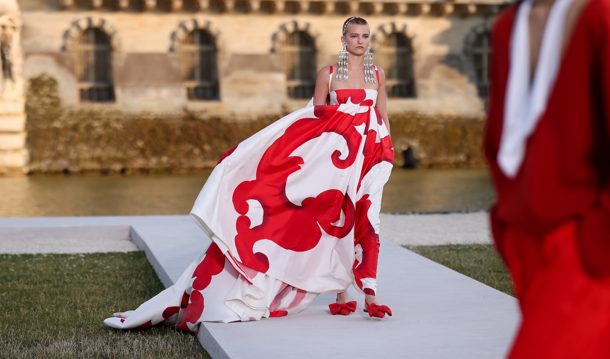 Růžové vlasy a průsvitné šaty Florence Pugh ovládly přehlídku Valentino na zámku