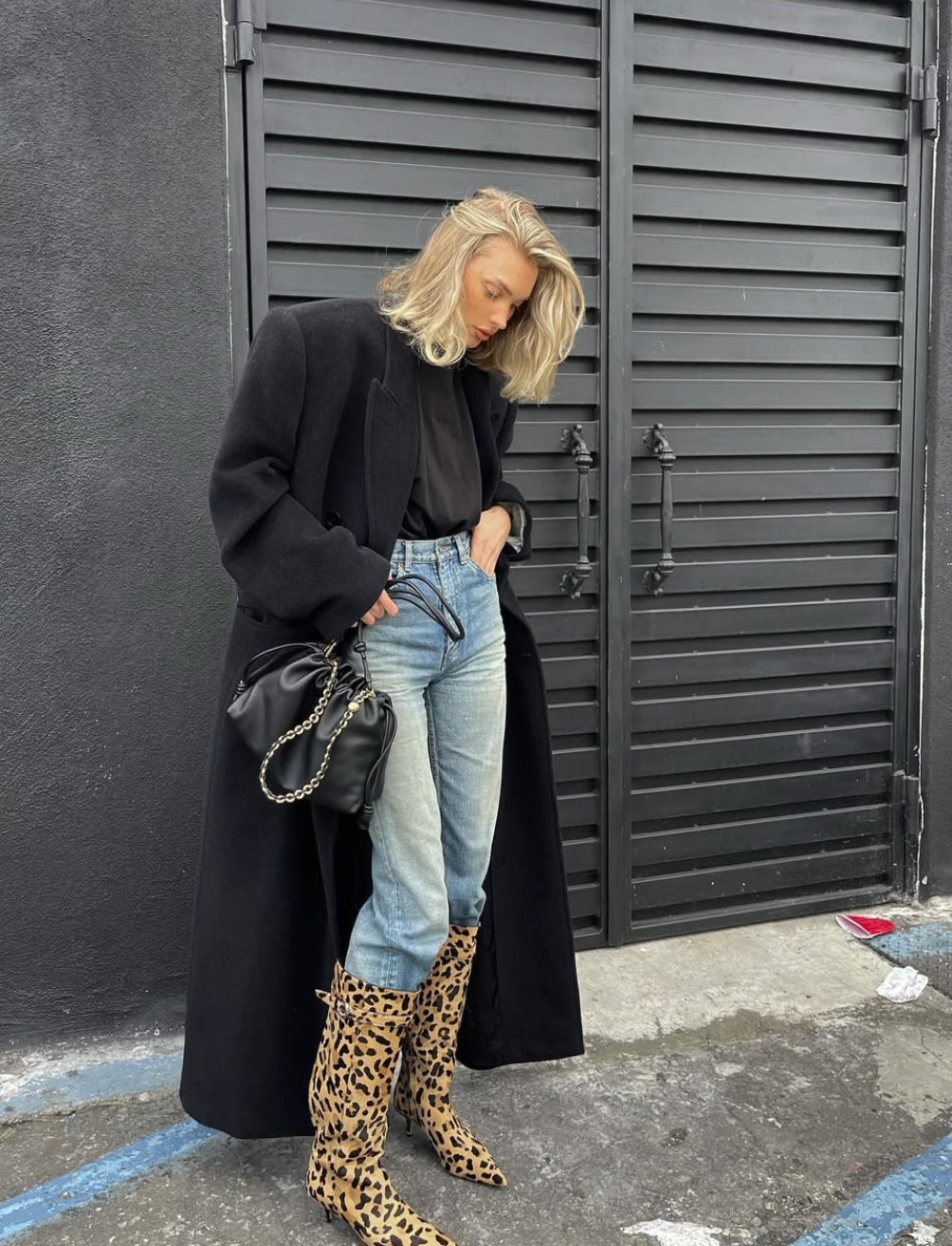 Outfit, který nemůže nikoho zklamat. Obsahuje vše, co ke klasice patří: strukturovaný dlouhý černý kabát, černou košili, oblíbené džíny a zábavný prvek – kozačky. Pokud vám připadá tahle kombinace trochu jednotvárná, přidejte boty se zvířecím vzorem. Jestliže vám nevadí zůstat u velmi monotónního vzhledu, zvolte klasické černé kozačky. Ale pamatujte, že móda je hlavně o zábavě, tak proč nezkusit i nějaký ten vzor.