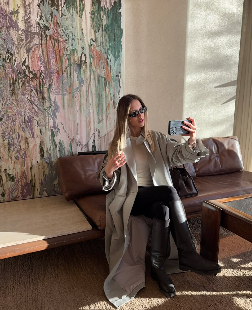 Začněme mým osobním favoritem. Pohodlný look, který přitom působí elegantně a sofistikovaně. Kombinace, do které se zamiluje každý. Ploché kozačky nad kolena jsou známé také jako jezdecké boty a představují ideální volbu k legínám. Vytvářejí uvolněný sportovnější vzhled, ale pokud se obáváte, že by mohl působit příliš casual, přehoďte přes sebe elegantní kabát a vznikne dokonalá rovnováha. S takovým outfitem zůstanete zároveň v teple a pohodlí, a ještě budete působit stylově.