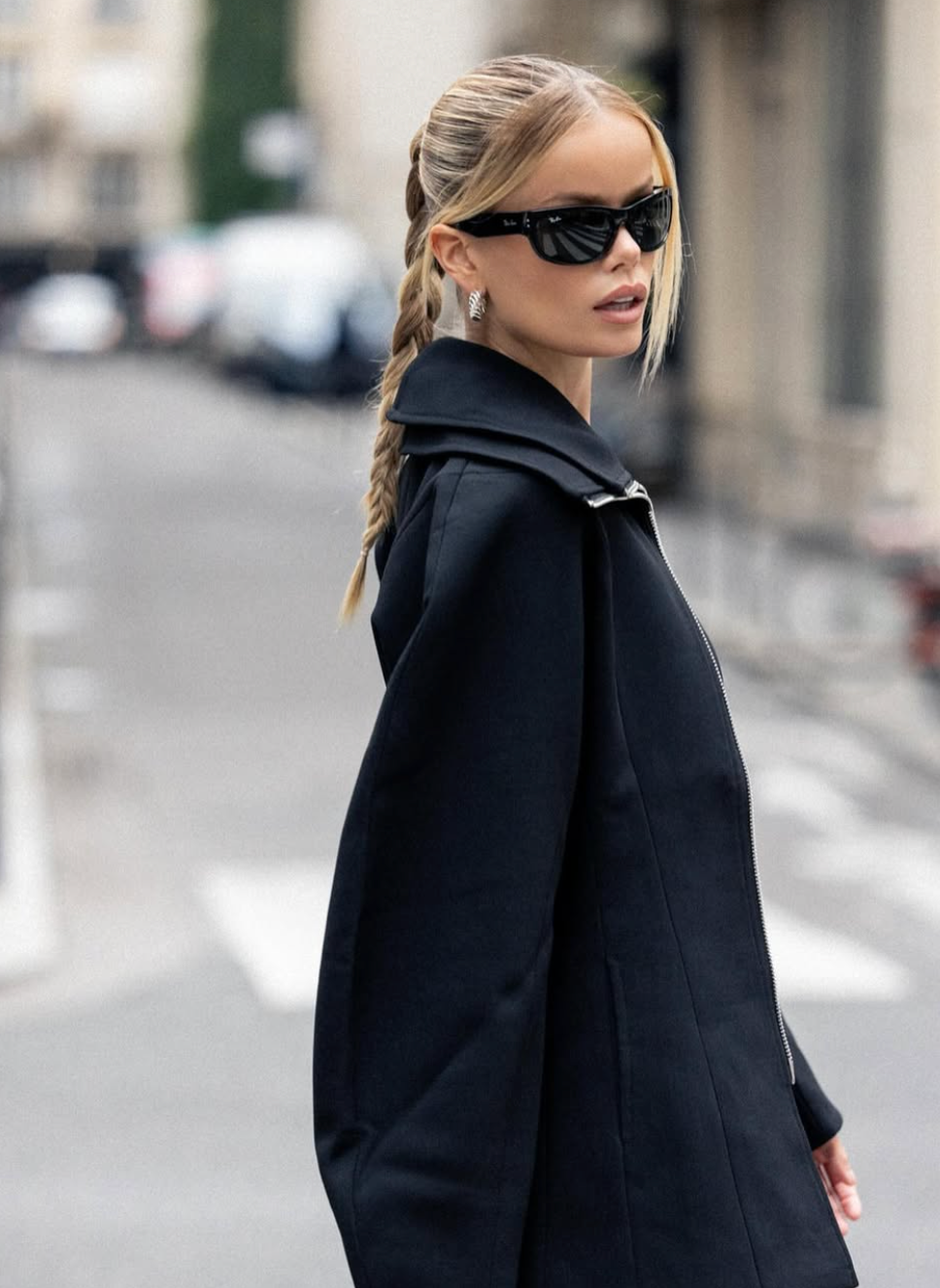 Obepínající sluneční brýle mají schopnost okamžitě proměnit celý outfit. Působí sportovně i futuristicky zároveň, jsou výrazné, ale přitom překvapivě nenucené. Jejich zakřivená silueta rámuje obličej způsobem, který působí sebevědomě, téměř jako ochranný štít pro oči.