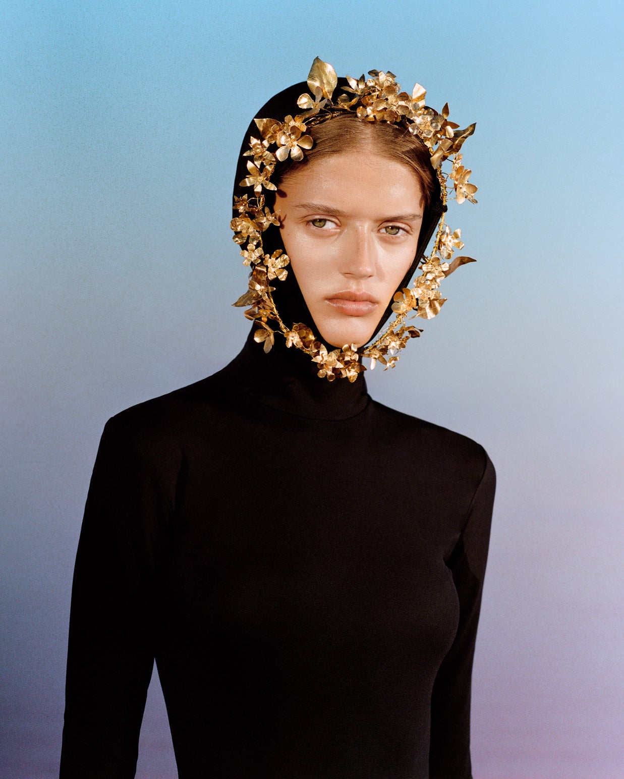 Kolekci, kterou neomezuje na jednu sezonu, vytvořil ze zlata, stříbra, slámy a tylu. „Spoustu materiálů jsme postupně nasbírali na vintage aukcích a bleším trhu. Květy tradičního ukrajinského slézu jsou z recyklovaných plastových lahví. Téma recyklace a upcyklace je pro mě v tuto chvíli naprosto zásadní,“ říká designér, jehož klobouky a čepice nosí mj. Kaia Gerber, Taylor Swift, sestry Hadidovy, Miley Cyrus, Irina Shayk, Nicky Hilton a Alicia Keys. Ekologický dopad své tvorby měl při navrhování i procesu výbory podle svých slov celou dobu na paměti. „Věřím, že tímto směrem bychom se měli dát všichni. Je to samozřejmě dlouhá cesta.“