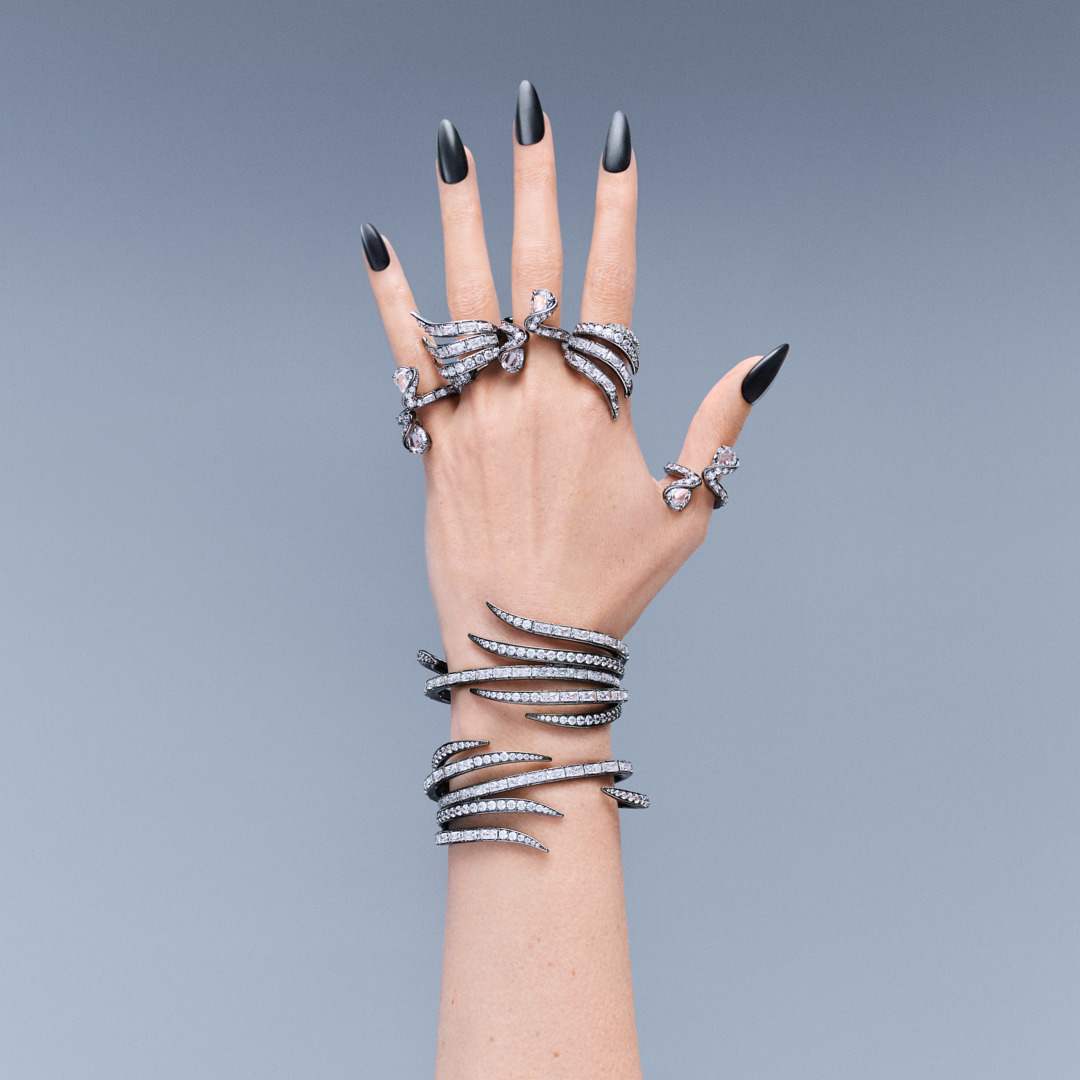 Výsledkem jsou šperky, které propojují klasické řemeslo s ostrou současností. Zářivé čiré krystaly se snoubí s temným rutheniem, vytvářejí kontrastní architektonické formy a evokují beztížný pohyb křídel. Abstraktní peříčka, osazení pavé a kombinace kamenů různých velikostí zvyšují brilanci každého kusu.