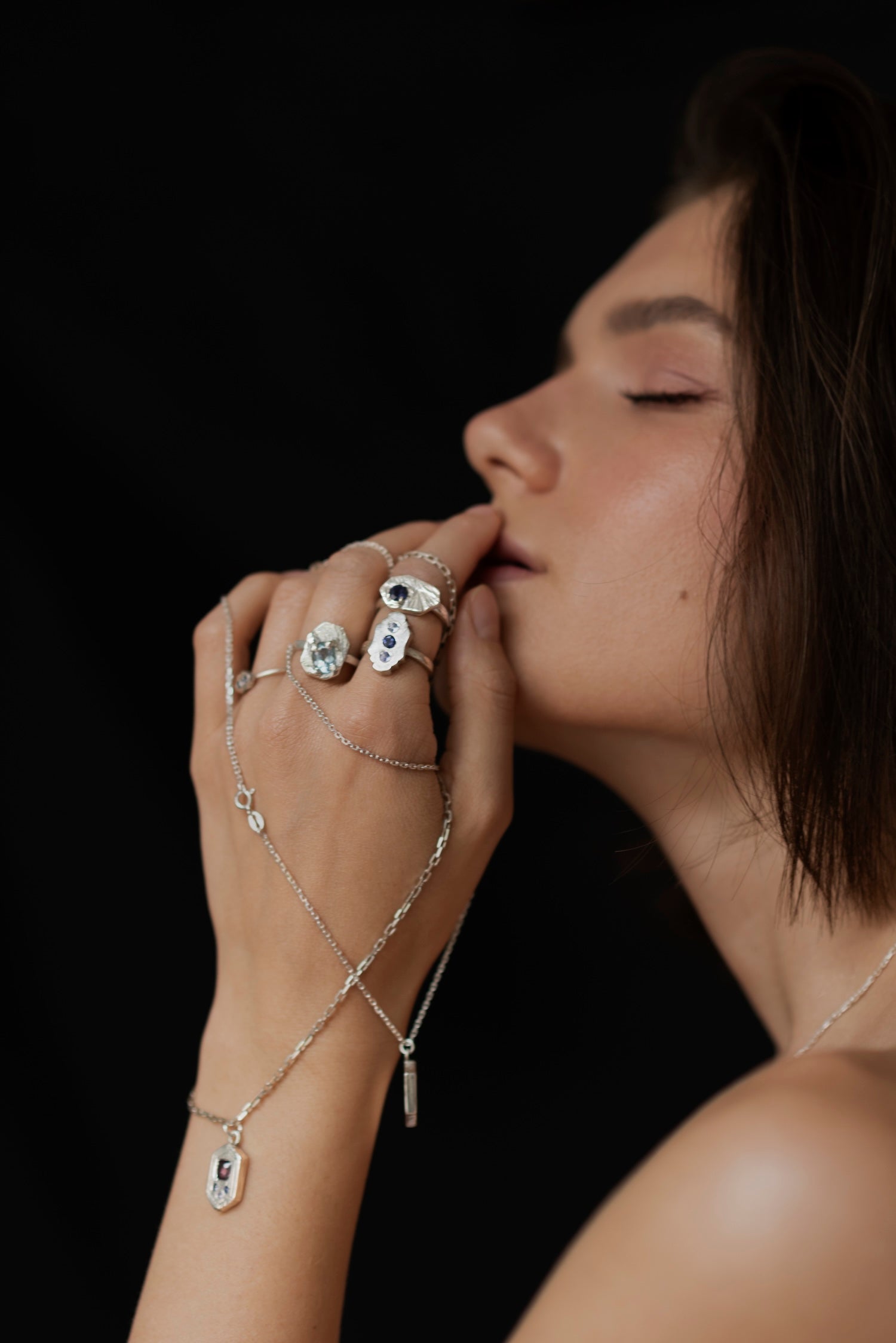 V nové kolekci Organic se šperkařka Renata Bachmann vrací ke svým dialogům s přírodou. Vznikly tak kousky postavené na organickém tvarosloví, hmatatelné artefakty plynutí tvarů a emocí doplněné o výběrové drahé kameny (ametyst, citrín, beryl nebo turmalín), jež kontrastují svou přesnou geometrií.