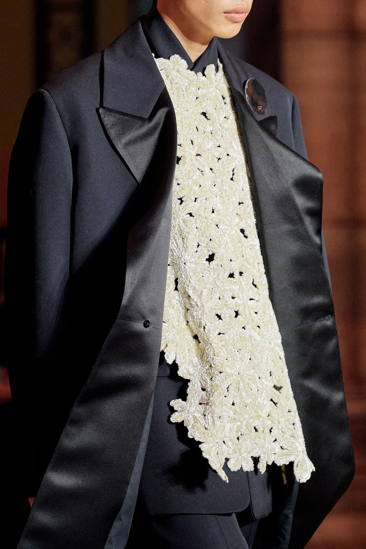 Nigo zas kluky na přehlídce Kenzo vyzbrojil květinovými zástěrami jako z normalizačního venkova nejen v Československu... A Jonathan Anderson dal u Loewe opět neúnavně promyšlenou kolekcí najevo, že tělo a jeho iluze je v realitě sociálních sítí skoro jedno a totéž. Záplavu fáborků jako z bojovky na škole v přírodě totiž modelové čeřili v jednoduchých tees a overalech s digitálním potiskem nahých těl. Lucka a Lukáš Meierovi u Jil Sander pro muže ještě ke všemu uháčkovali roztomilé náprsenky a Silvia Venturini Fendi jako by mužům chtěla vzkázat: „Teď to můžete nosit jako ženy, kabát a pod něj krátkou délku (kalhot) a k tomu podkolenky.“