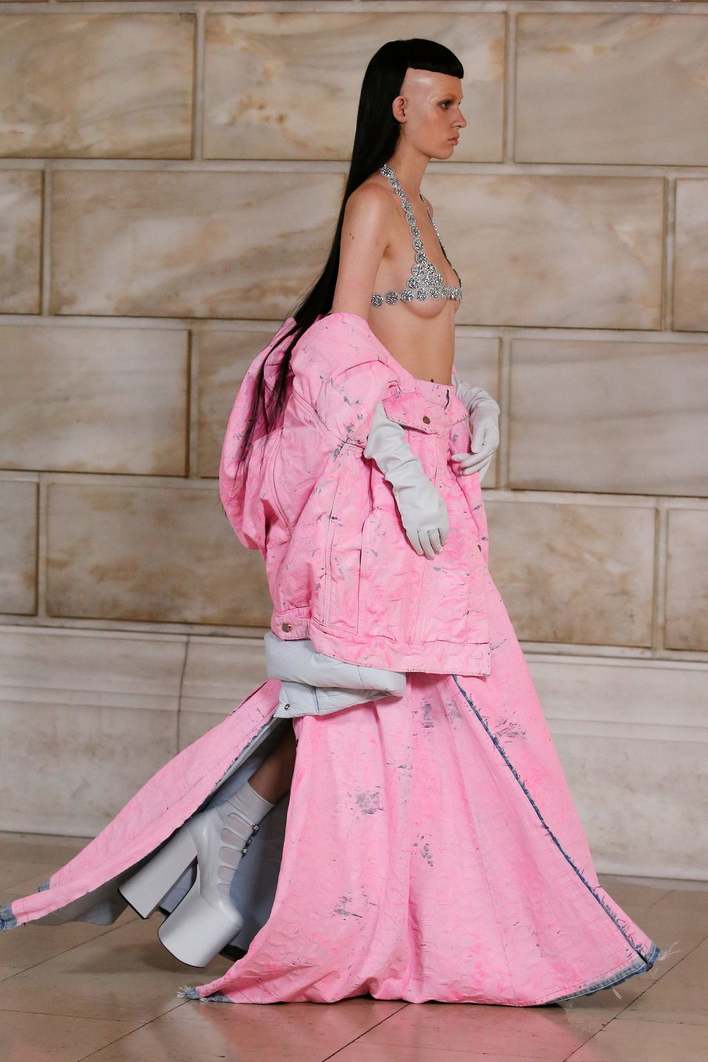 Nemá cenu se ji snažit zachytit nějakými souhrnými přívlastky, zdá se, že takovým způsobem se móda v době sociálních sítí už ani popisovat nedá. Ta kolekce totiž vůbec není originální, ba ani novátorská (na moha místech dokonce připomíná jiné kolekce jiných autorů z minulosti, ale ne tak zřejmě), je jen jednoduše dobře postavená s ambicí rozehrát show. A to je vlastně to jediné, co jsme kdy po Marcovi chtěli. Objemy a styling hip hop oděvů z devadesátek přepracoval ve formě večerních rób a k tomu přidal retro reference. Když mu tohle zafungovalo, stačilo si pohrát s barvami a finalními kombinacemi. Někde přidat, jinde zas nohu z plynu určitě raději sundal. I přesto jeden cringe moment na diváky přehlídky čekal. To, když si v poznámkách ke kolekci začali před opening lookem číst Nietzeho citáty. Úsměvné, přeci jen je vidět, že je Marc dítě starého módního světa.