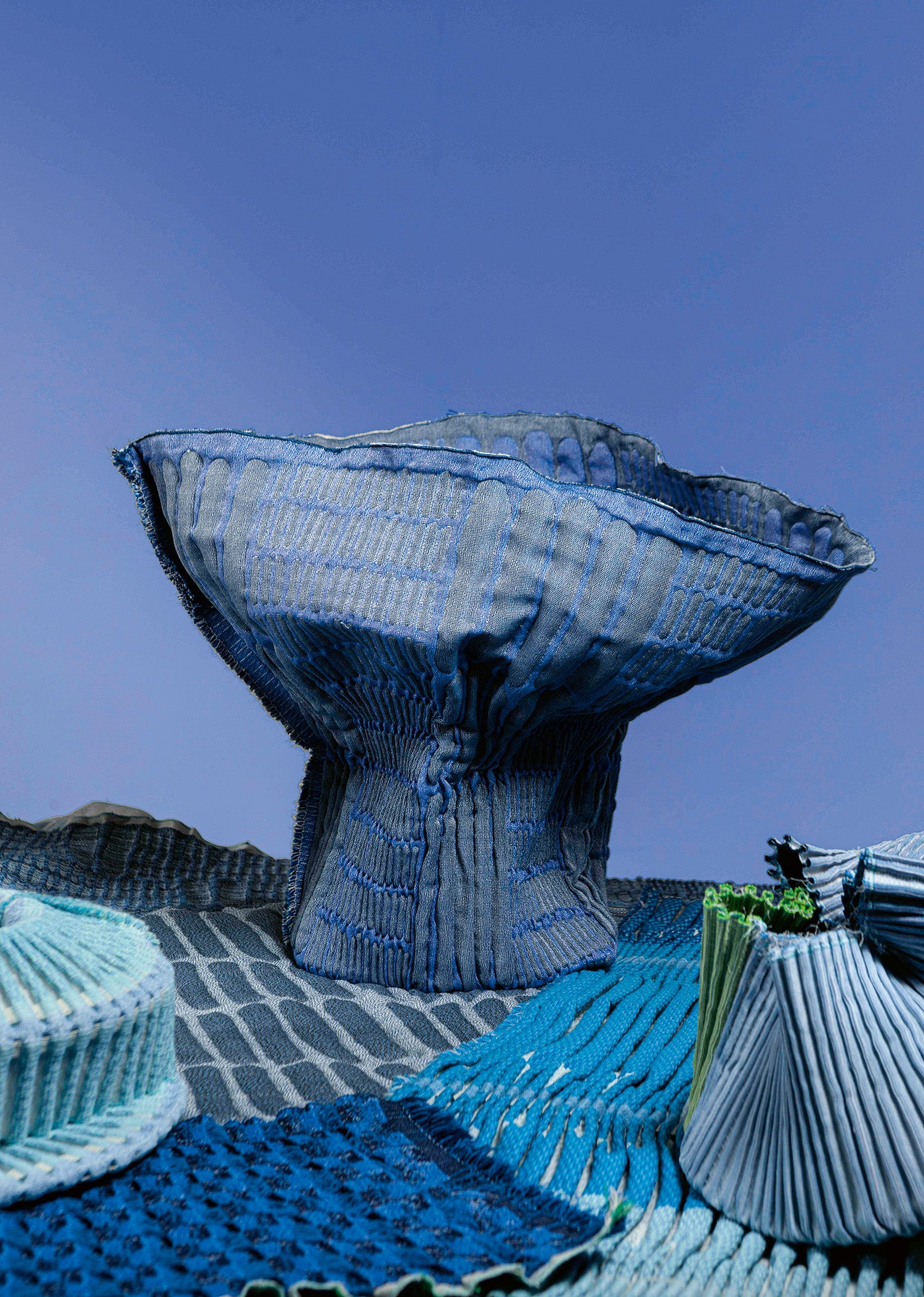 Zavěšená na lankách a levitující v prostoru ani nepřipomíná kolekci oblečení, spíš sbírku oděvních solitérů. Její výtvarnou povahu určil prvotní a ryze osobní podnět: „Oslovila jsem tři umělkyně zastupující různou zkušenost s mateřstvím či mateřským přístupem, neboť se to téma stalo středobodem i mého života,“ vysvětluje Kristýna Lovas Šenkýřová v ložnici svého holešovického bytu. Navštěvuji ji v období třetího trimestru. „Abych mohla vyprávět příběh, rozhodla jsem se oslovit ženy ze tří různých generací, jejichž kontrastní výpovědi odhalují zajímavé souvislosti,“ vysvětluje. Do pomyslných hlavních rolí proto obsadila sochařku a výtvarnici Adélu Matasovou, fotografku a multimediální tvůrkyni Veroniku Šrek Bromovou a také performativní umělkyni, nedávnou laureátku Ceny Jindřicha Chalupeckého Marii Tučkovou. „Bylo to velmi intenzivní i inspirativní. Už na začátku jsem si stanovila, že to nemůže být mama kolekce, nechtěla jsem vytvořit diplomku, co by působila jako soubor těhotenského oblečení. Studium jsem chtěla završit jakýmsi oděvním obrazem žen, jež kromě zvoleného tématu, tedy mateřství v kontrastu s uměleckou kariérou, spojuje i práce s tělem, kterou každá zpracovává po svém,“ doplňuje návrhářka. Z intimních rozhovorů s každou z nich sestavila sérii skic plnou dojmů a z nich pak vzešly samotné oděvy. Výsledkem její práce se stal osobní pohled na mateřství a na jeho vývoj na pozadí příběhů tří inspirativních žen.