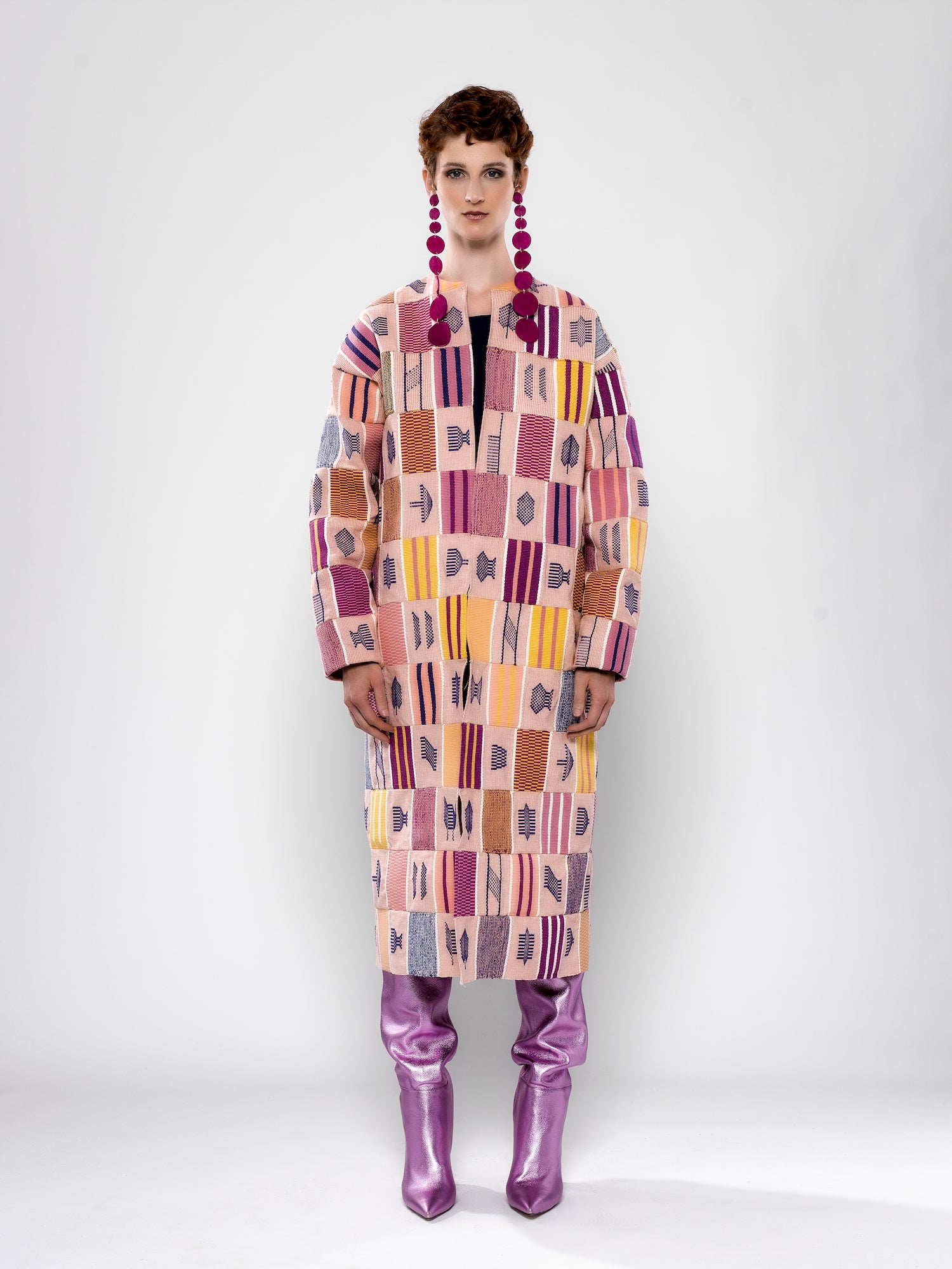 Ayissi kombinuje anglický tvíd s ručně tkanou bavlnou a kapokem obarveným indigem v Gambii nebo tradiční ghanskou textilií kente. Pruhované bavlněné plátno pochází z japonského města Hamamatsu, z něj designér vytvořit kimonový top a k němu kalhoty z dan fani, bavlněné látky typické pro Burkinu Faso. Jemná krajka od Sophie Hallette se odráží ve vzoru indigem barvené adire eleko z Nigérie. Lýko z Madagaskaru doplňuje dvojité hedvábí z Itálie.