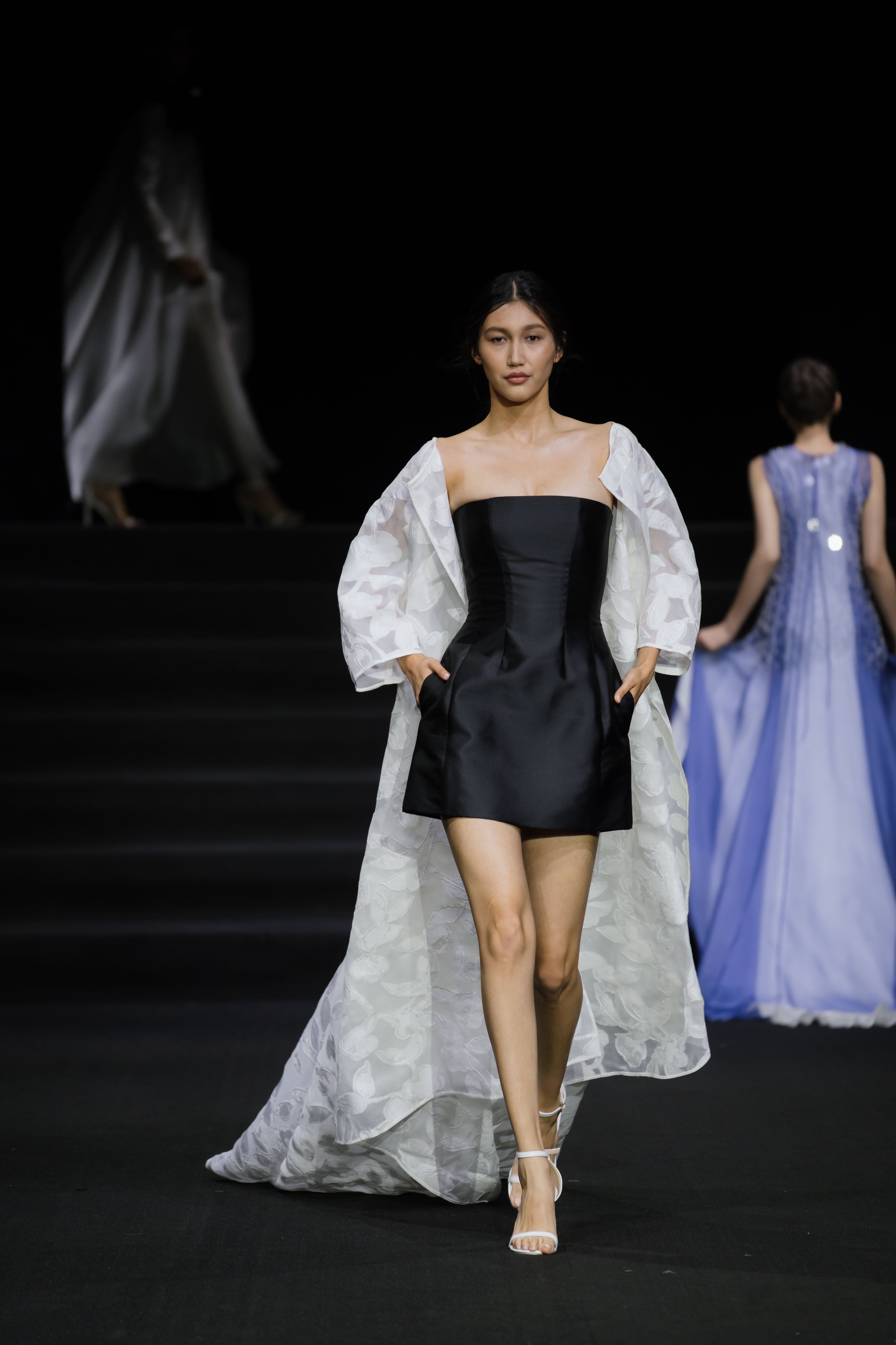 Designérské duo Saken Jaqsybaev a Akmaral Zharaskyzy z Kazachstánu přineslo na přehlídkové molo kolekci, která na první pohled propojuje vzdálené světy – japonský minimalismus, středoasijskou estetiku a duchovní symboliku Východu. Inspirovali se japonskou malbou, tradičními dřevoryty, kimonem i krajinou Dálného východu a jejich vliv přetavili do elegantních, architektonických siluet.