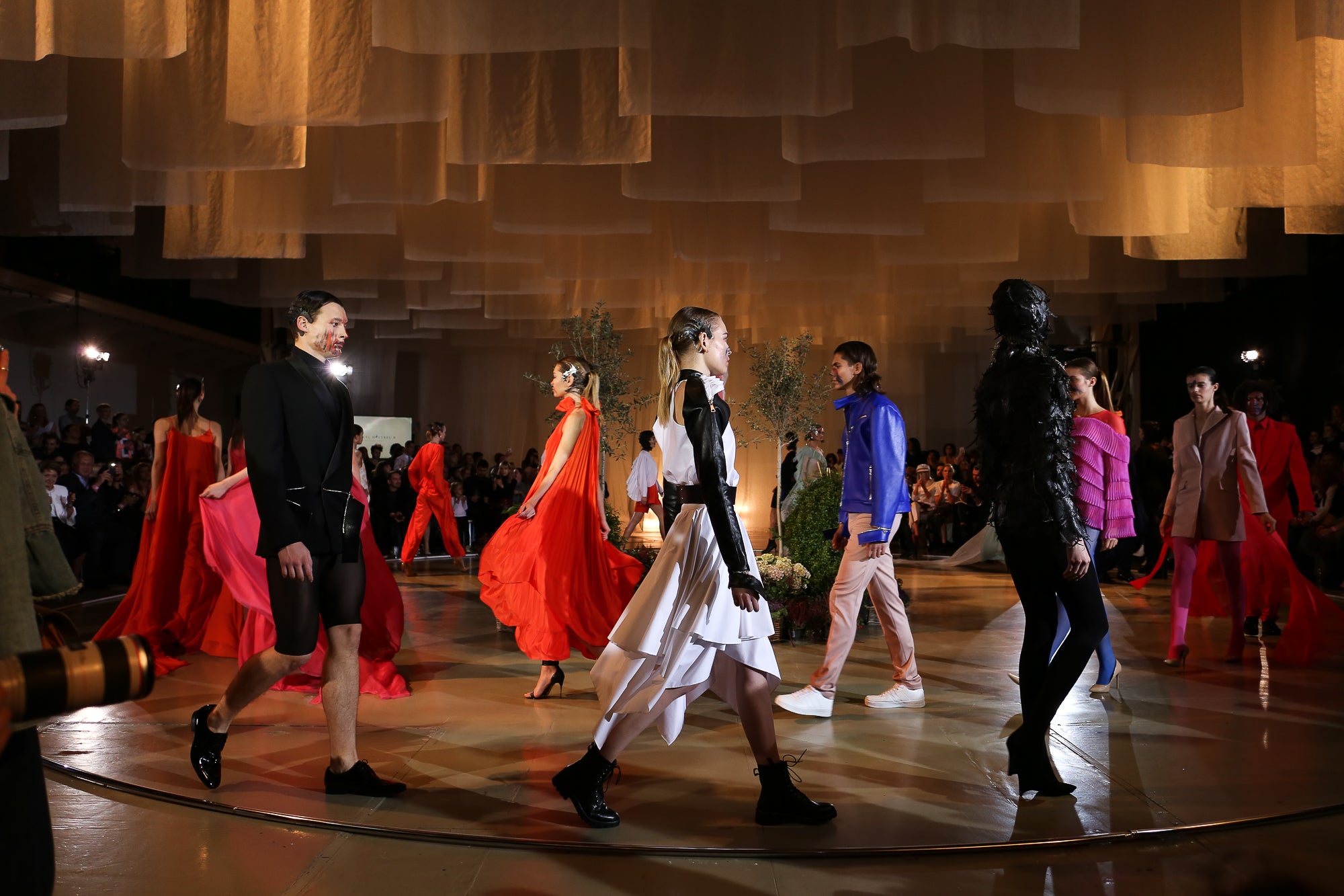 Už samotná scéna, která se v historické budově Staré tržnice s každým ročníkem mění, jistě působila na ty, kteří si v našich zeměpisných šířkách za poslední léta zvykli sledovat módu v minimalistických kulisách a choreografiích, občerstvujícím dojmem. Tentokrát dostala pod taktovkou vyhlášených slovenských architektů Petera Gondy a Maťa Kolcúna podobu kruhové, podsvícenou kovovou obručí vymezené stage, nad níž se vznášely délkově odstupňované prápory transparentní bílé textílie. Padlo jí více než kilometr, přesně 1466 metrů, a efekt byl, i díky barevnému nasvícení, velkolepý, přitom až puristicky čistý.