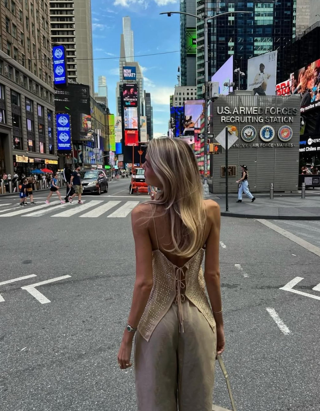 A nakonec možná nejjednodušší, ale rozhodně ne méně důležitý lehký a minimalistický look: kdo by nemiloval volné krajkové tílko a lněné kalhoty? Je to dokonalá kombinace jednoduchosti a pohodlí. Přidejte roztomilou proutěnou kabelku, která umí vyvolat pocit, že za pár týdnů budete na pláži.