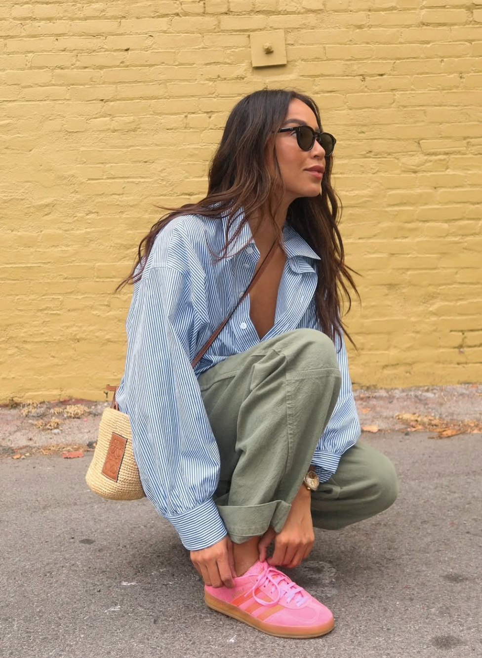 Pastelové odstíny k oslavám jara, jak už jsem zmínila, rozhodně patří… a přesně o tom je tento look. Růžová, zelená a pruhovaná modrá košile. Dokonalý outfit, pokud se chcete cítit stylově, a přesto maximálně pohodlně.