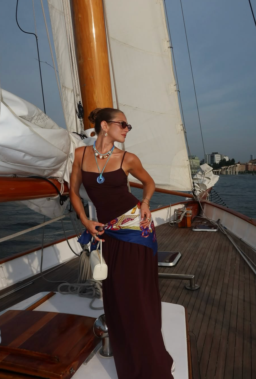 Nezapomínejte, že hnědá není výhradně barva podzimu, naopak. V létě vypadá naprosto úchvatně, zvlášť na opálené pokožce a v kombinaci s barevnými šperky. Když si vezmete šaty a kolem pasu omotáte hedvábný šátek, vykouzlíte si siluetu přesýpacích hodin (ať už ji od přírody máte, nebo ne).
