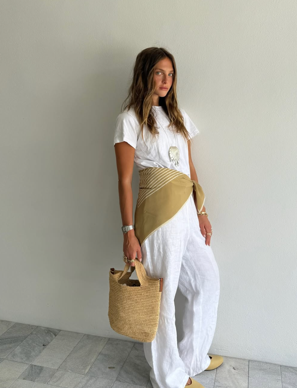 Lněné kalhoty jsou letní must-have. Abyste ale svůj look patřičně vyladili, přidejte výrazný náhrdelník, proutěnou kabelku a již zmíněný hedvábný šátek. Pokud je váš outfit kompletně laděný do bílé barvy, vyplatí se zaměřit na detaily a obléct své doplňky do kontrastního (ale sladěného) odstínu. Právě šátek kolem pasu dodá outfitu nádech francouzského šarmu.