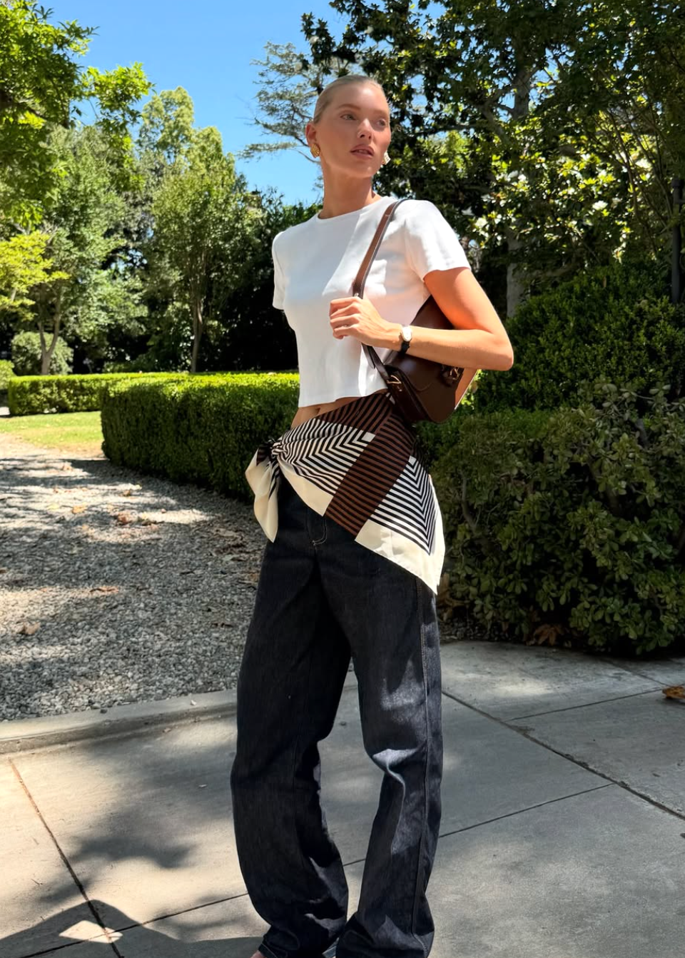 Bez ohledu na roční období – džíny v našich šatnících zůstávají za všech okolností. Elsa Hosk je názorným příkladem, jak je právě v létě nosit s grácií: jednoduché bílé tričko a džíny využívá jako dokonalý základ, ke kterému vrství doplňky podle nálady. A hedvábný šátek kolem pasu? Dodá jakémukoliv outfitu originalitu, aniž by působil přeplácaně. Nezapomeňte po jejím vzoru ani na výrazné náušnice – i ty dokážou celý look rozzářit.