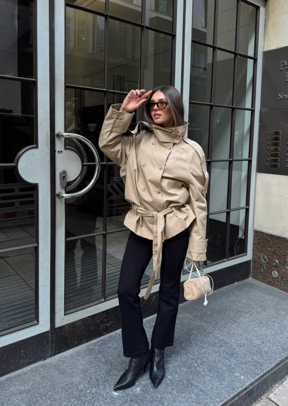 Když se řekne béžová, jedním z prvních kousků, který nás napadne, je trenčkot. Béžový trenčkot je základním kouskem každého šatníku. Je to ideální kabát pro jakoukoli příležitost a dodá eleganci každému outfitu. V tomto případě sáhněte po oblíbené kratší verzi trenčkotu a doplňte ji trendy černými kalhotami. Celý look pak sjednoťte černými doplňky, které outfit krásně propojí.