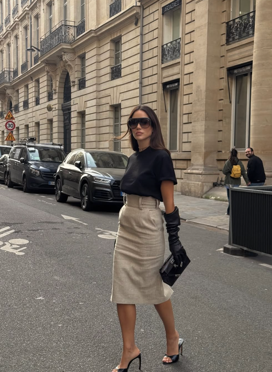 Kdyby měla nadčasová elegance podobu outfitu, vypadal by právě takhle. Abychom ale tento klasický look přenesli do současnosti, stačí přidat oversized sluneční brýle a oversized černé tričko, které ho lehce odlehčí. Outfit tak působí nenuceně cool, ale stále si zachovává svůj elegantní a sofistikovaný nádech. Celý look pak skvěle doplní dlouhé kožené rukavice, které mu dodají modernější vzhled.