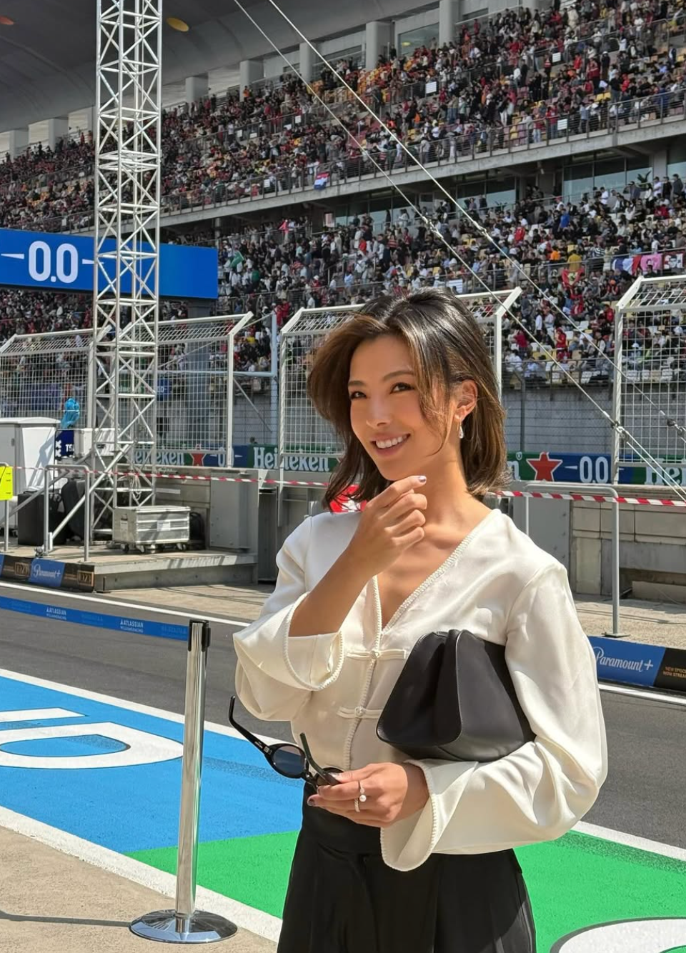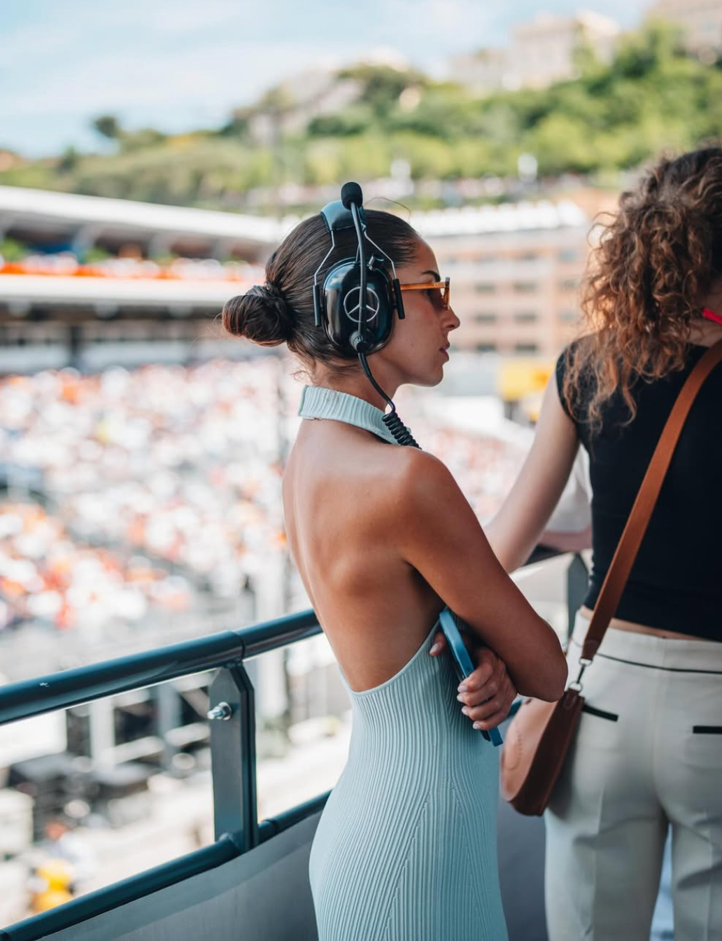 Tento look je ze skříně Carmen Montero Mundt – elegantní, jednoduchý a přirozeně noblesní. Jemné modré šaty jsou ideální volbou na Grand Prix, přesně vyvažují módu a F1. Ve spojení s uhlazeným drdolem a týmovými sluchátky jde o definici paddock glamouru.