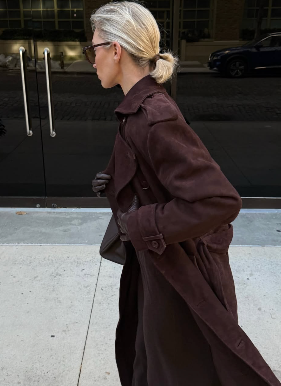 Ach! Dlouhý semišový trenčkot! S tím nikdy neuděláte chybu, obzvlášť pokud je z kvalitního a odolného materiálu. Na chladnější den ho zkombinujte s klasickými koženými rukavicemi, trendy kabelkou a pilotkami, které outfit perfektně doladí.