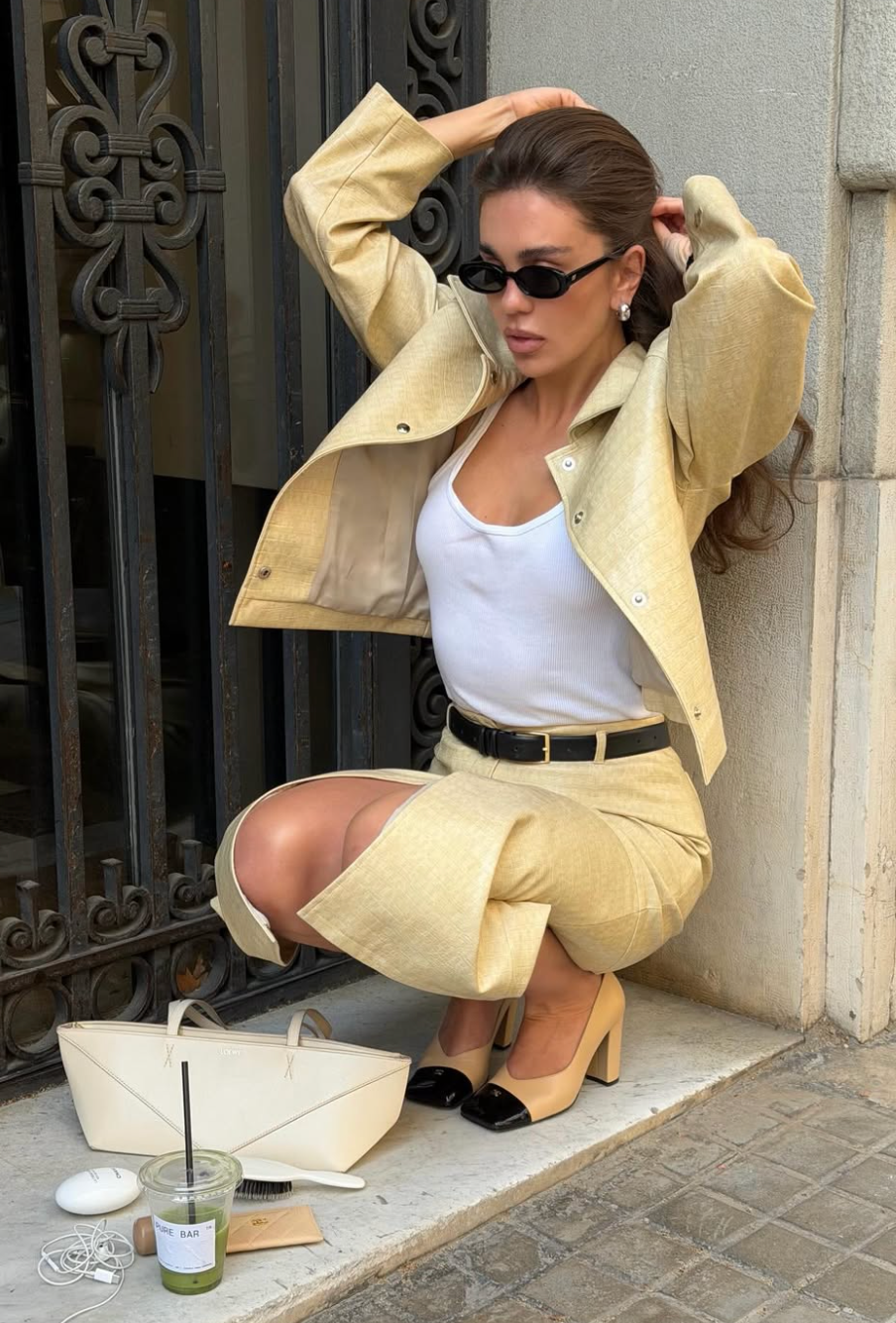 Set bundy a sukně v trendy jarní barvě je ideální outfit, který je snadný na styling a zároveň působí upraveně. Skvěle funguje jak do kanceláře, tak i na kávu s kamarádkou. Máslově žlutý kožený set od ukrajinské značky One by One je naprosto perfektní volbou a dá se doplnit například o nové lodičky bez paty se čtvercovou špičkou od Chanel. Dokonalost v jednom outfitu!