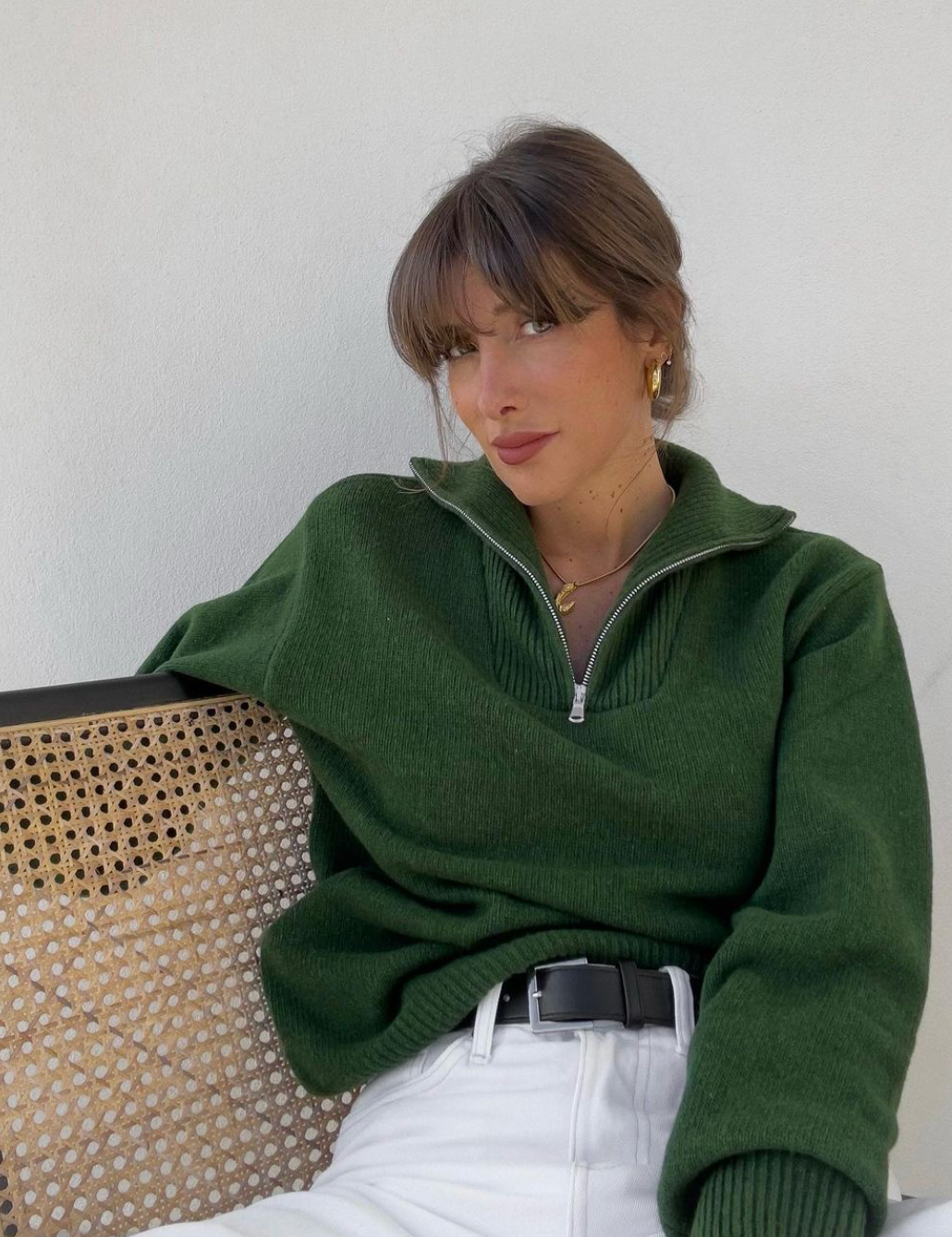 Svetr s polovičním zipem je perfektní kousek pro každou příležitost, protože se řadí spíše mezi elegantní loungewear, a to díky svému polo střihu. Je to jeden z těch vzácných kousků, který je zároveň dokonalý pro práci z domova, ale i do kanceláře a coby součást ležérního víkendového outfitu.