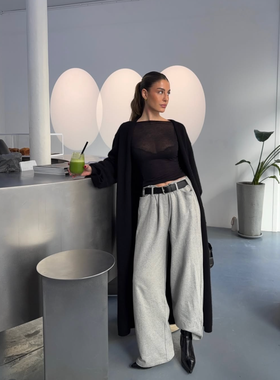 Aby outfit zůstal pohodlný, přidejte kalhoty ve stylu tepláků a dlouhý kardigan. A jako třešničku na dortu celý look dolaďte doplňky – zlatým náramkem a kotníkovými botami na podpatku.