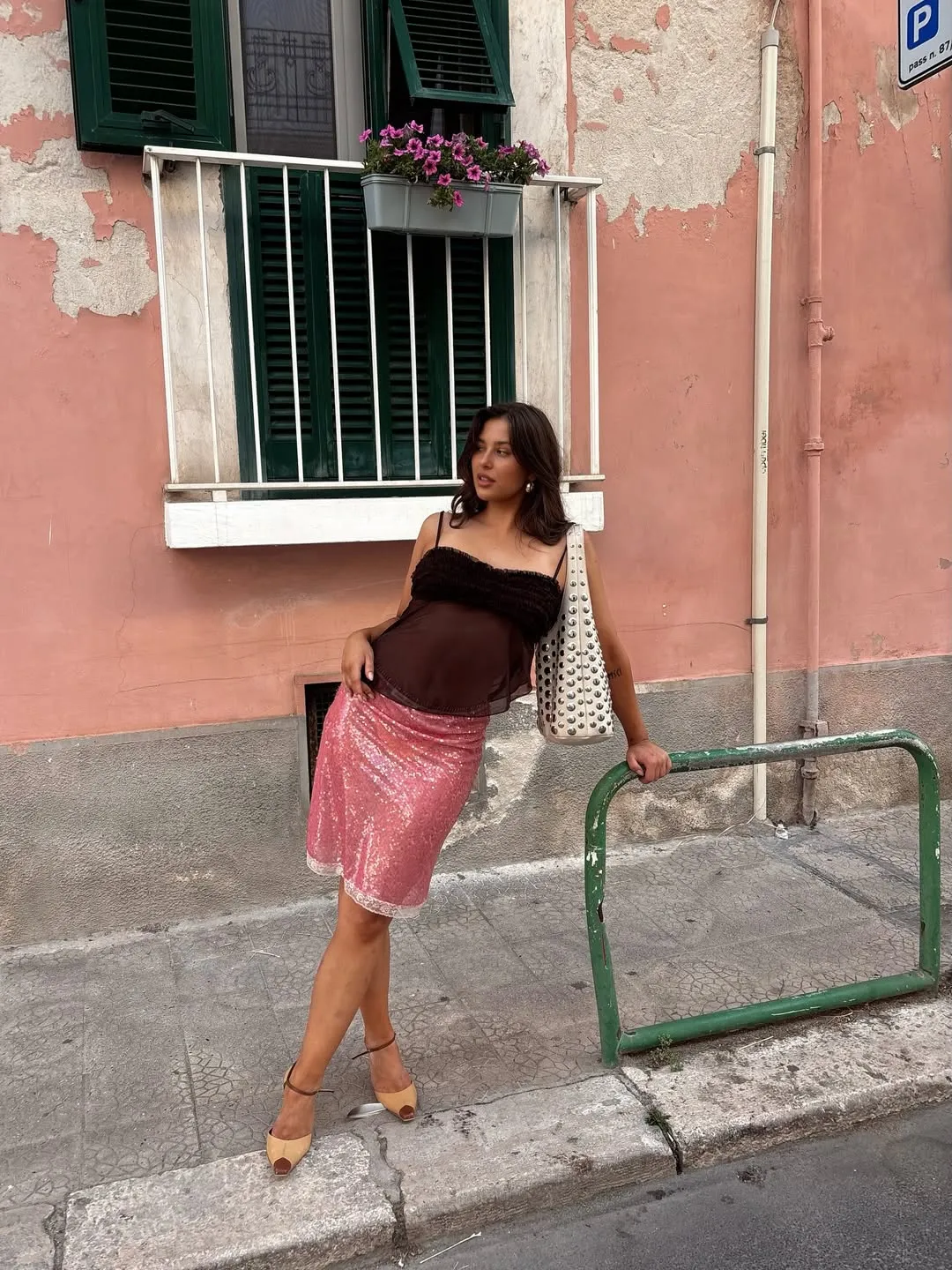Léto 2025 patří dalšímu modelu, který splňuje všechna uvedená kritéria, a proto mu na sociálních sítích právem patří nadšené reakce. Jde o nízko na boky posazenou sukni sahající ke kolenům, která na první pohled zaujme dvěma detaily: je růžová a je posetá flitry. Model Camillo pochází od španělské značky Hand Over, kterou jsme si zamilovali díky jejímu nečekanému hitu – bavlněným trenýrkám, které proměnila v nejžádanější spodní prádlo sezony. Trend kombinování prádla a pyžam s každodenním oblečením je stále na vzestupu a Hand Over ho posouvá dál.