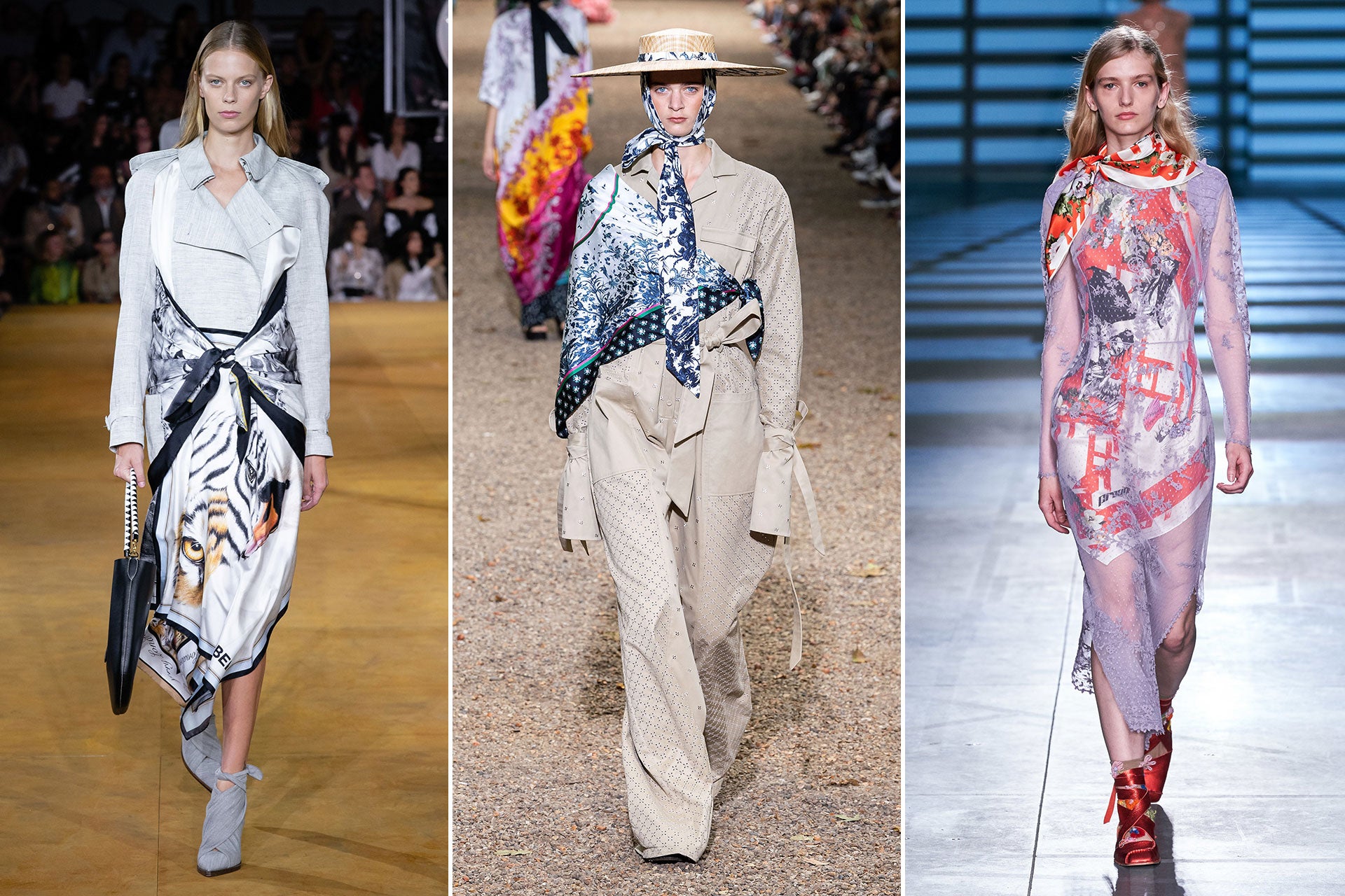 Hedvábný šátek se vrací s velkou slávou a novými plány. Určitě inspiruje street style v tom, jak vrátit do hry, co zdánlivě vyšlo z módy. Ten svůj budete nosit kolem pasu (Burberry), svázaný přes jedno rameno (Erdem) nebo dokonce jako šaty (Preen).