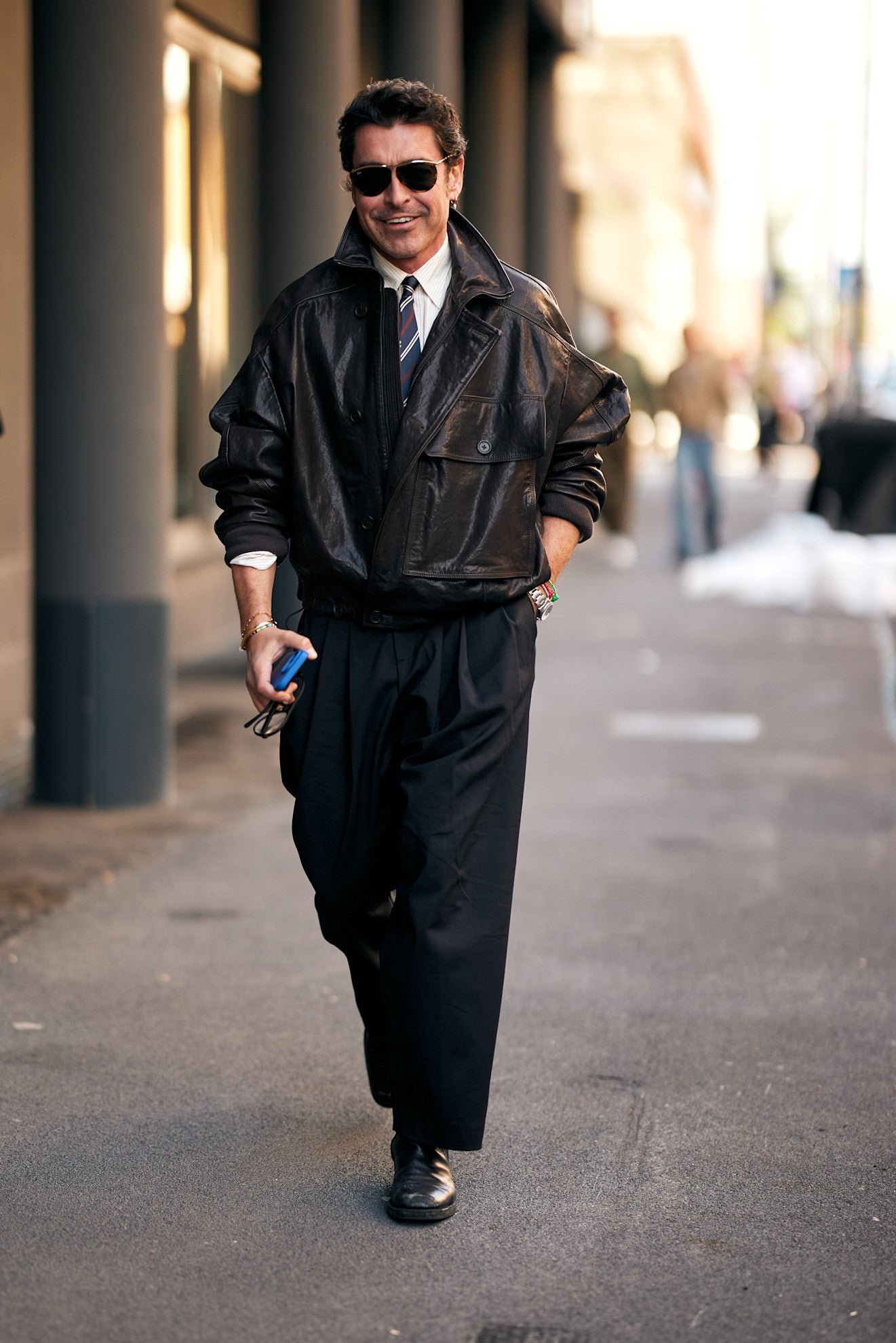 Kostýmek patří mezi nejklasičtější položky šatníku. V kombinaci s košilí a kravatou by mohl působit až příliš doslovně, kdyby nepřišel kontrast v podobě kožené bundy či kabátu. Právě ty narušují formální základ a dodávají outfitu módní náboj. Výrazná kravata, ideálně v červeném tónu, se stává klíčovým akcentem, který celý look sjednocuje a dodává mu charakter.