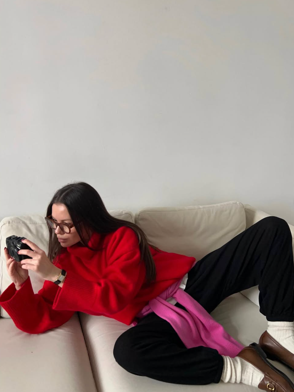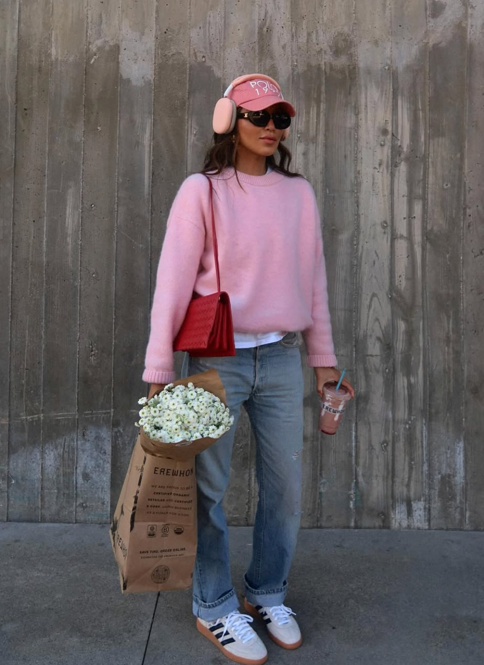 Pokud nejste zvyklé nosit barvy, tenhle outfit pro vás může být o letošním Valentýnu tou nejjednodušší volbou. Klasika, kterou všechny milujeme – svetr, džíny a tenisky. Stačí jim však vdechnout trochu barvy a celý look hned dostane nový, svěží nádech.