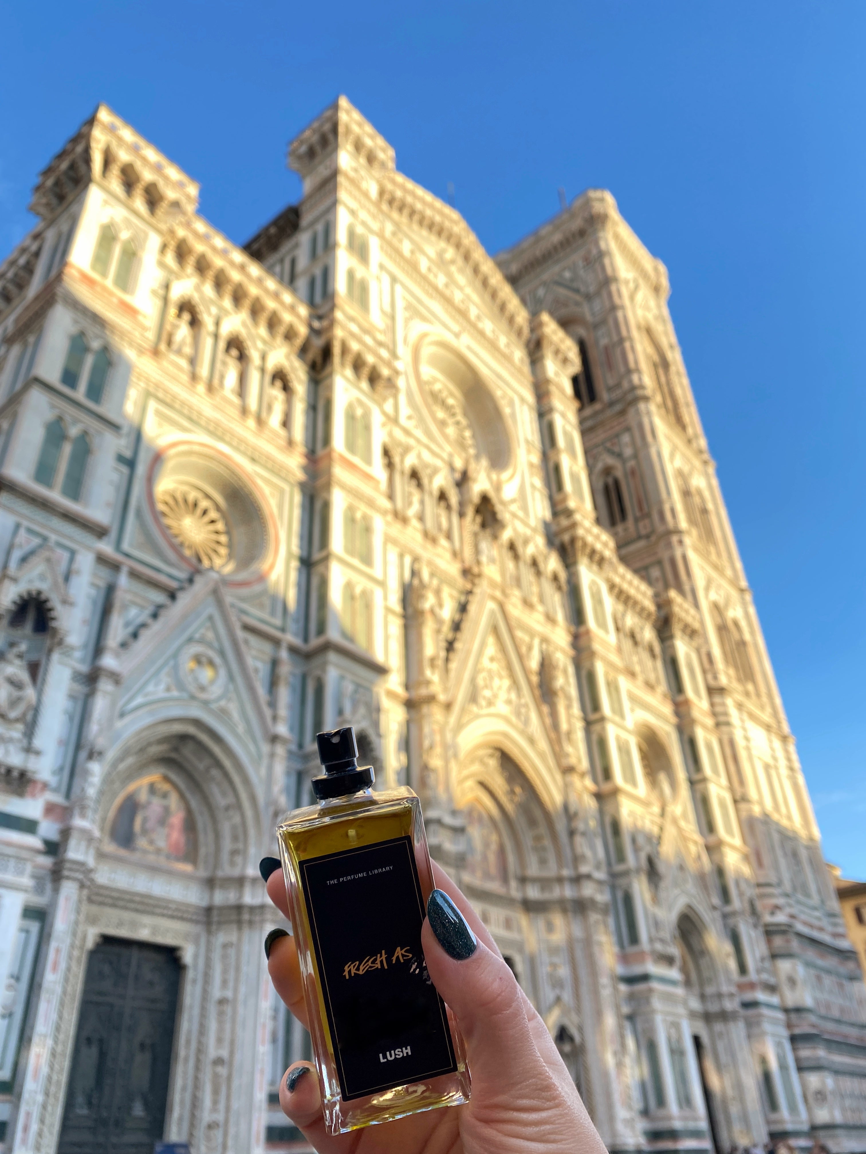 My Lush journey began labelling pots and bottles as a Christmas temp in 1999, straight after leaving high school. I worked alongside Simon Constantine to create a quality control system to check for adulteration to our essential oils and absolutes, as well as learning to mix/compound the fragrances for perfumes and products. For a number of years I travelled with the buyer to see how the materials were grown, processed, and I checked the quality standards. Eventually over time I became the buyer for natural ingredients and Essential oils/Absolutes which was incredible, and then I became a mother, and could no longer get to travel as much as I did. My fragrance creativity began in 2015 (after a Lush career of several job roles) with product perfumery for our new Oxford Street flagship store in London which opened that same year. We manufacture the products, distribute and retail the products in our stores. Although I don’t have the same technical training as those in the perfume houses of Grasse, I have managed to teach myself some techniques enabling me to create fragrances for various product applications which are predominantly unpackaged. 2019 saw the opportunity for me to create my first collection of perfumes for our ‘Perfume Only’ Lush store in Florence Italy, inspired by its history, art, and architecture of this beautiful city.