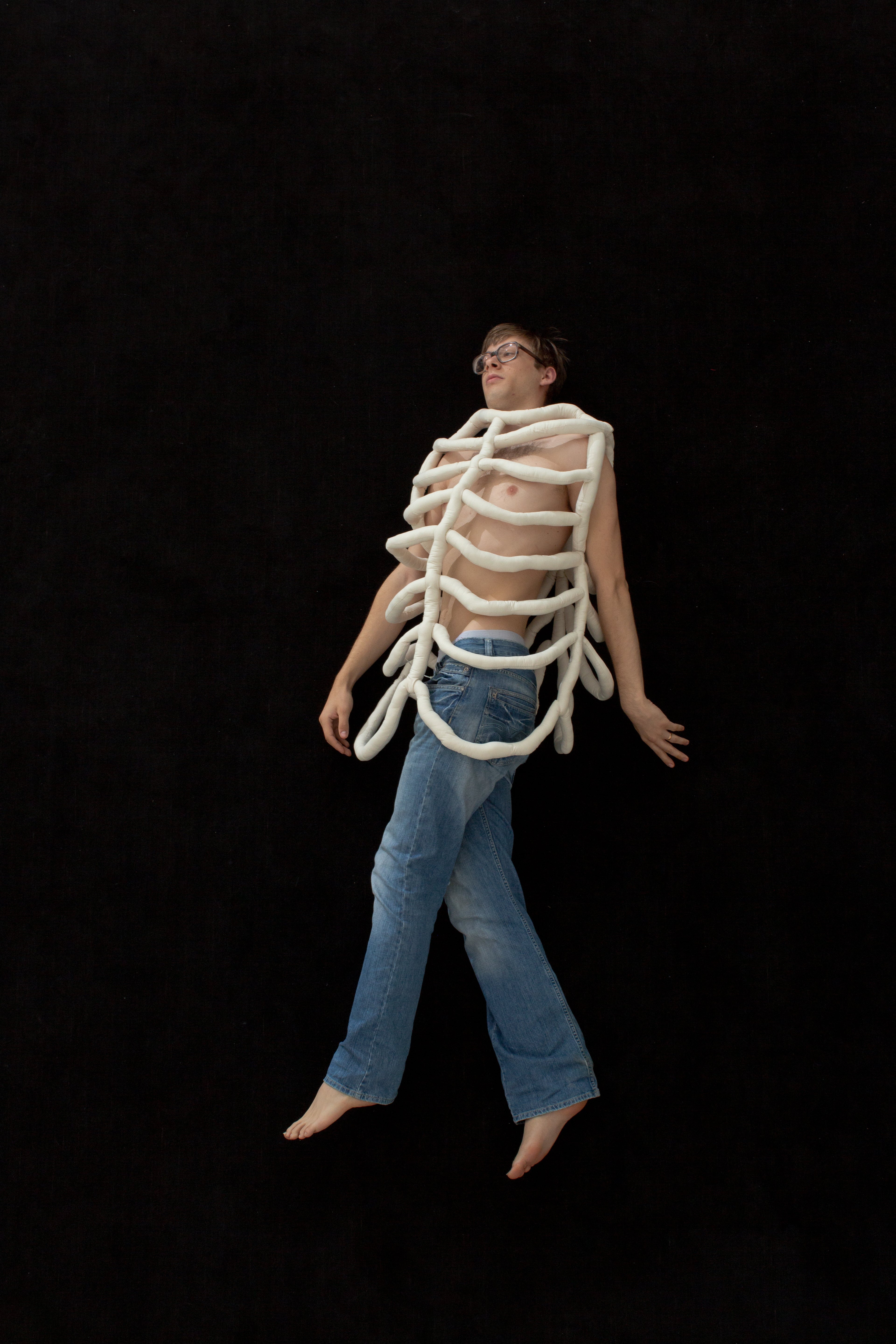 Moje tělo není ostrov má podobu obrovského těla, částečně rybího, částečně lidského, a nabízí tak anatomickou procházku krajinou normativity a útlaku, jíž jsme všichni součástí a kterou v každodenním životě spoluutváříme svými těly, chováním i příběhy. V břiše fragmentovaného těla leží různé krabice a přepravní bedny, z nichž jako by se chystaly uniknout zvířecí a lidské bytosti ztělesněné kostýmy. Motiv přepravní bedny je symbolem pohybu a přesunu, dobrovolného či vynuceného, z jednoho místa či stavu do druhého, a je tak typickým znakem naší naléhavé potřeby roztřídit vše do úhledných krabic i našeho strachu z mnohoznačnosti. Kostýmy jsou přitom druhou kůží, která může ukazovat emoce, jež se nám nedaří tak snadno vyjádřit slovy, a také nástrojem, jak se přiblížit situaci někoho, jehož pocity, postoje nebo činy jinak neumíme hlouběji pochopit. Duch celé instalace spočívá v kolektivním volání po životě, v němž má větší místo vzájemná empatie.