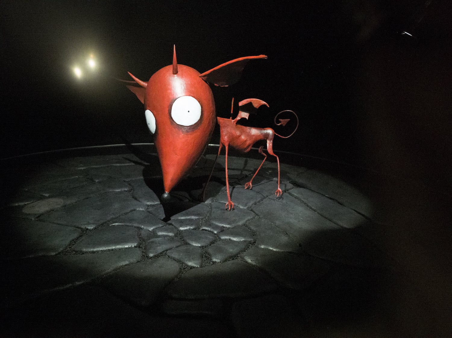 Přikládám oko k okýnku na první kouli a podívám se dovnitř. V ten moment jsem v Sirotčinci slečny Peregrinové pro podivné děti. Je to tak sugestivní, že mimoděk ucuknu. Kouknu se jiným okýnkem. Je to, jako kdyby kamera změnila úhel. Paráda! Hned se rozeběhnu po ostatních koulích. V pár vteřinách jsem nadosah všem svým oblíbeným dřevěným celebritám: vyčáhlému zloději Vánoc Jackovi, dobře zamřelé nevěstě, miniaturním Umpa-lumpům, vojákovi s dírou v hrudi... Rotuju mezi koulemi, měním úhel své osobní kamery a jsem zcela v moci Burtonova světa. Koule plní účel, Burtonova invaze je nemilosrdně všepohlcující. A když na mě na konci výstavního sálu vybafne férový metr a kus vysoký Marťan s nabobtnalým mozkem, je moje uspokojení dokonalé.