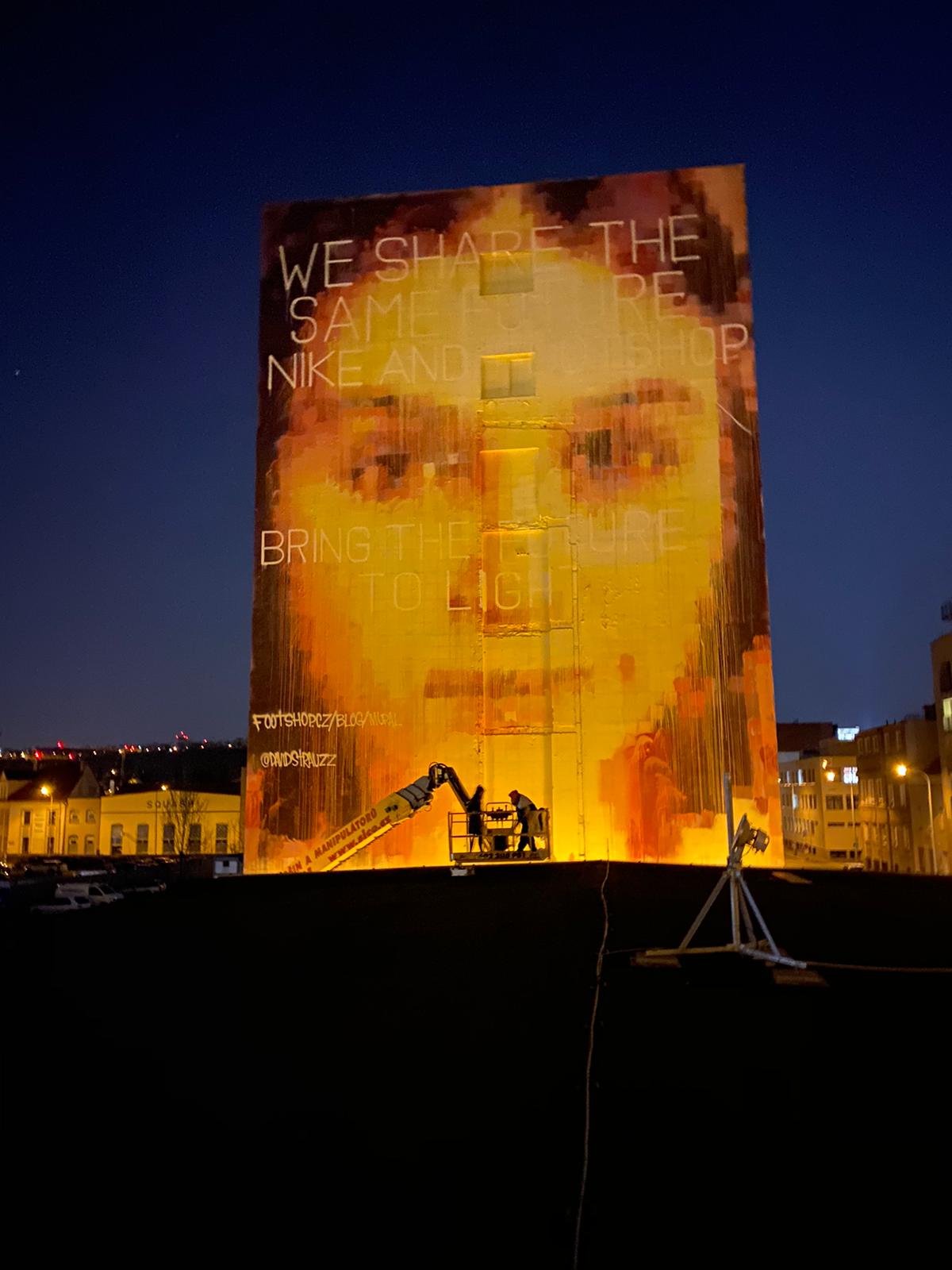 Je pátek dopoledne. Svítí slunce, on maluje. Když si podáváme ruce, baví mě tím, jak v sobě rozpoznává typicky českou náturu. „Kdyby byla zima, stěžoval bych si stejně jako teď na to slunce.“ Proti němu se chrání kšiltovkou a kusem látky, i přestože působí soustředěně, chová se pozorně a zdvořile. S malbou pomocí spreje započal ve čtvrtek navečer, a v momentě našeho setkání, tedy v pátek před obědem, už má skoro hotovo. Street art prostupuje celou jeho osobností. Jako by on sám byl stěnou, na kterou někdo maluje. Při rozhovoru, který spolu následně vedeme, se nad tím ještě mnohokrát zamyslím.