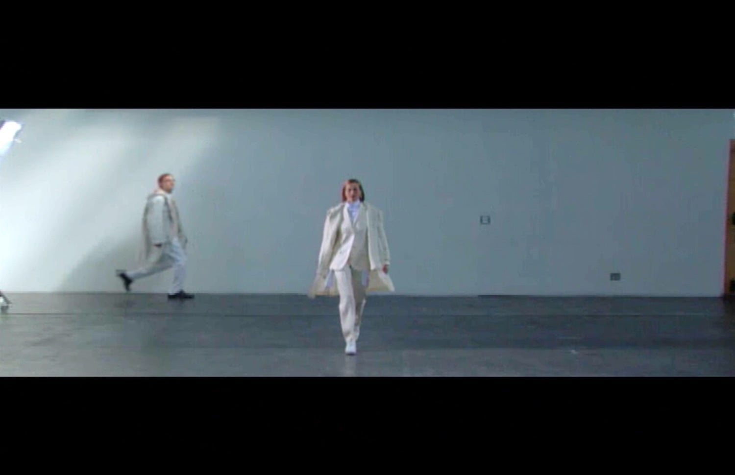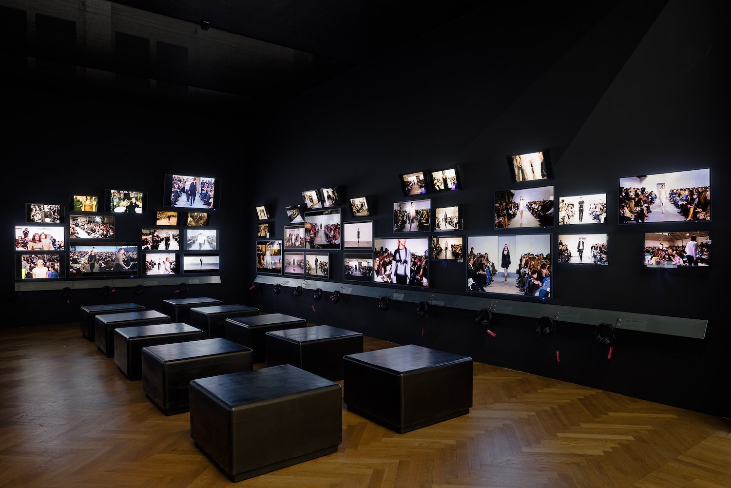Celá jedna výstavní hala se proměnila v prostor těsně před módní přehlídkou z roku 1988, jen místo židlí vidíme na podlaze zakreslené pozice pro sezení hostů a směr, kudy budou chodit modelky a modelové. Helmut Lang touto přehlídkou zrušil obvyklé vyvýšené pódium pro modely, ti teď jednotlivě i v jakoby spřátelených skupinách procházejí uličkami mezi hosty. Jsou různého (i na první pohled nerozlišitelného) genderu a věku. Kurátoři výstavy nechávají nahlédnout do půdorysu Langovy módní přehlídky, ukazují ji z organizačního hlediska a jako byznys. Dívám se, kolik prostoru v prvních řadách je věnováno redaktorům Vogue, kde sedí Anna Wintour, kdo vedle ní.