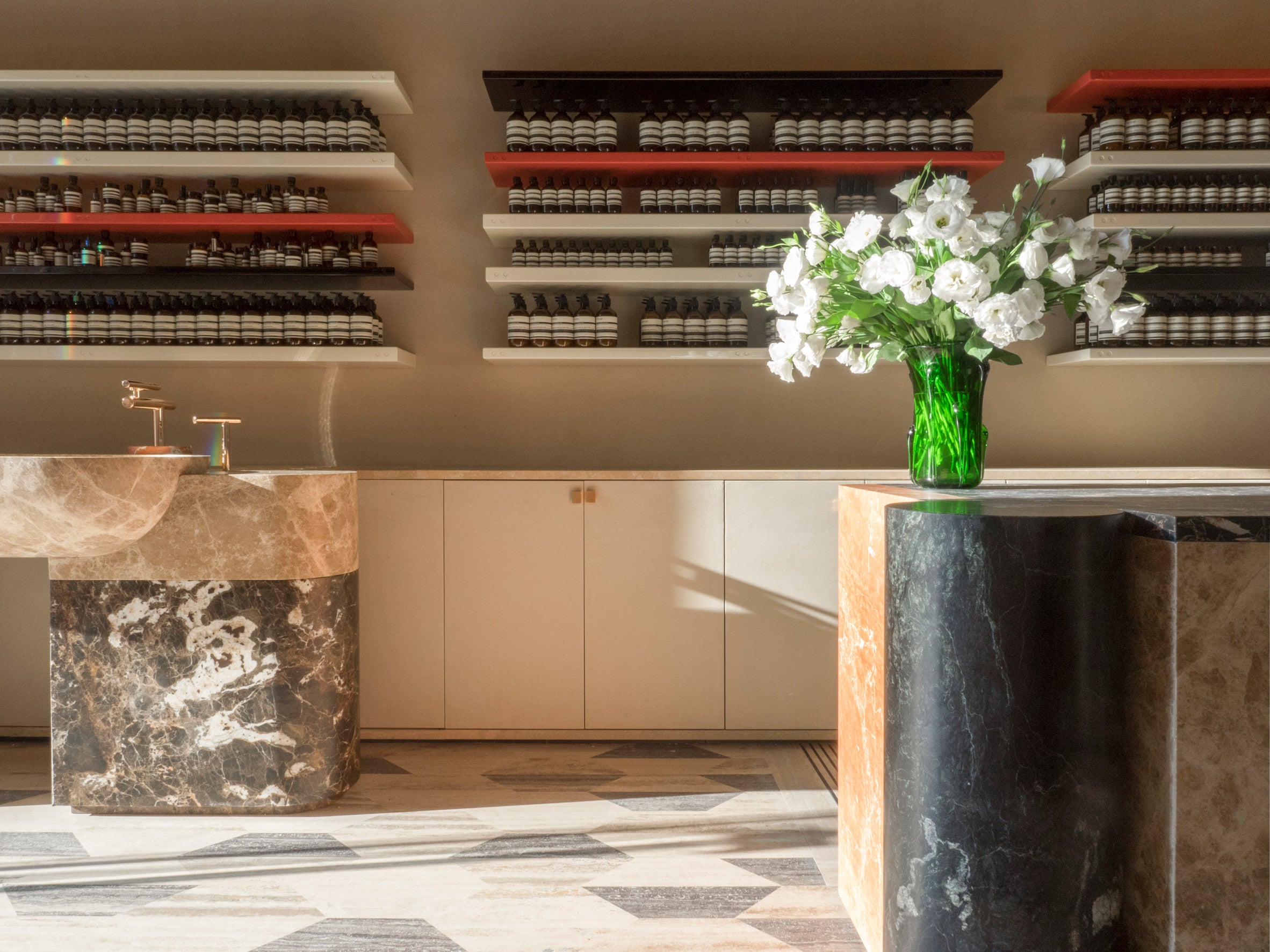 Podlaha z tmavě šedého travertinu odkazuje na nedaleký kostel. Obrovský blok z tmavě zeleného a růžového mramoru tvoří centrální prvek interiéru, nad kterým se tyčí závěsná lampa vyzařující tlumené oranžové světlo. Mramor v pískovém odstínu byl použitý k vytvoření dvou samostatných umyvadel, kde si můžete všechny produkty vyzkoušet na vlastní kůži. Mým favoritem je krém na ruce a mýdlo Resurrection s vůní mandarinkové kůry, rozmarýnu a cedru. Zbláznit se můžu z nekonvenční orientální vůně Marrakech Intense a osvěžující gelové masky Blue Chamomile, která zažene všechny stopy únavy z dlouhé cesty.