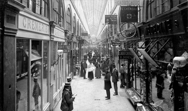Ještě na začátku 19. století připomínala Paříž tržiště, zachycené ve filmu Parfém: Příběh vraha. Centrum města obývala chudina, ulicemi se trousila stáda dobytka a lidé se snažili ucpanými tepnami procpat k „břichu Paříže”, tržnici Les Halles. O pár desítek let později už se obyvatelé Paříže mohli procházet pod čistými, světlými a zastřešenými průchody mezi domy, které zdobily nádherné mozaiky, naleštěné výlohy i křišťálové lustry. V tomto světě v malém, jak pasáže popisuje dobový průvodce, začali lidé navštěvovat „zastřešené ulice”, které byly plné obchodů, do nichž mohli vyrazit i za té největší plískanice. „Pasáže byly proslulé a oblíbené pro svou grandiózní výzdobu,” píše filozof Walter Benjamin ve svém nedokončeném projektu Pařížské pasáže. Luxusní, mramorem vyložená pasáž se podle něho stala stěžejním symbolem moderního města a také kamenným svědectvím vzestupu měšťanské třídy, která se namísto práce mohla věnovat zahálce, nákupům a okázalé spotřebě.